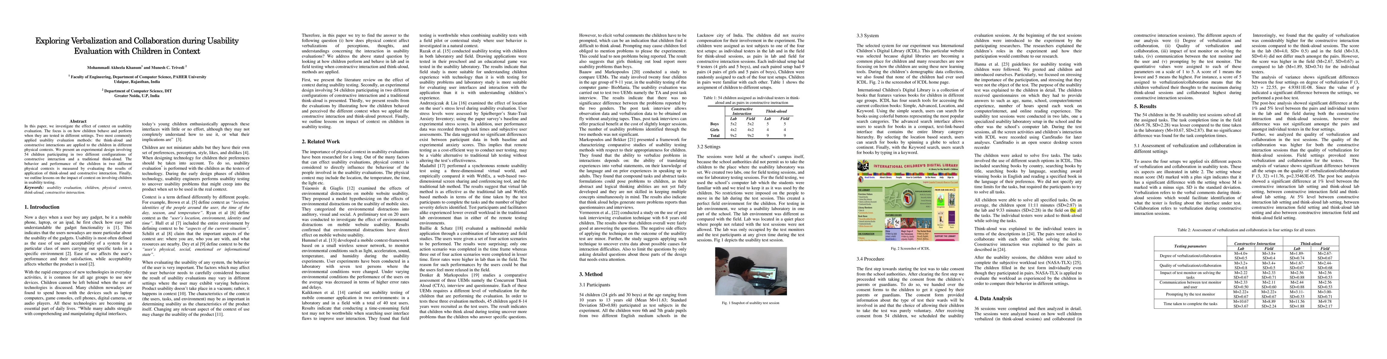 This paper examines how different physical contexts influence children's behavior and performance during usability evaluations using think-aloud and constructive interaction methods. The study involved 54 children in various settings, highlighting the impact of context on usability testing with children.