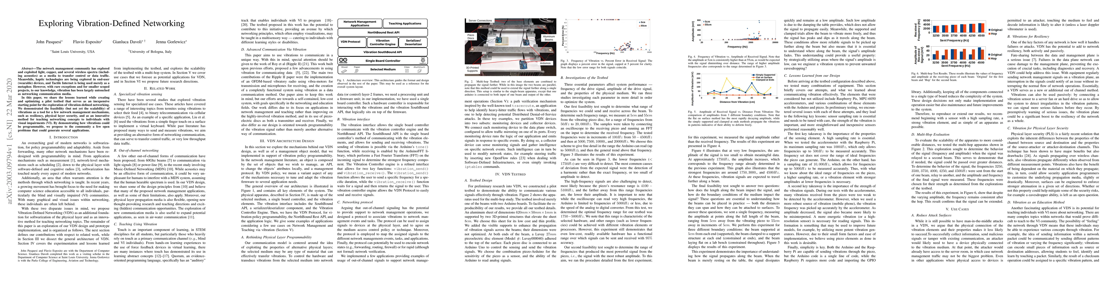 The network management community has explored and exploited light, copper, and several wireless spectra (including acoustics) as a medium to transfer control or data traffic. Meanwhile, haptic technologies are being explored in end-user (wearable) devices, and Tactile Internet is being used merely as a metaphor. However, with rare exceptions and for smaller scoped projects, to our knowledge, vibration has been largely untouched as networking communication media. In this paper, we share the lessons learned while creating and optimizing a pilot testbed that serves as an inexpensive starting point for the exploration of vibration-defined networking. We demonstrated the feasibility (but not yet the scalability) of vibrations as a tool for a few network management mechanisms, such as resiliency, physical layer security, and as an innovative method for teaching networking concepts to individuals with visual impairments (VI). By demonstrating how vibrations could be programmable, we propose to the community a few open problems that could generate several applications.