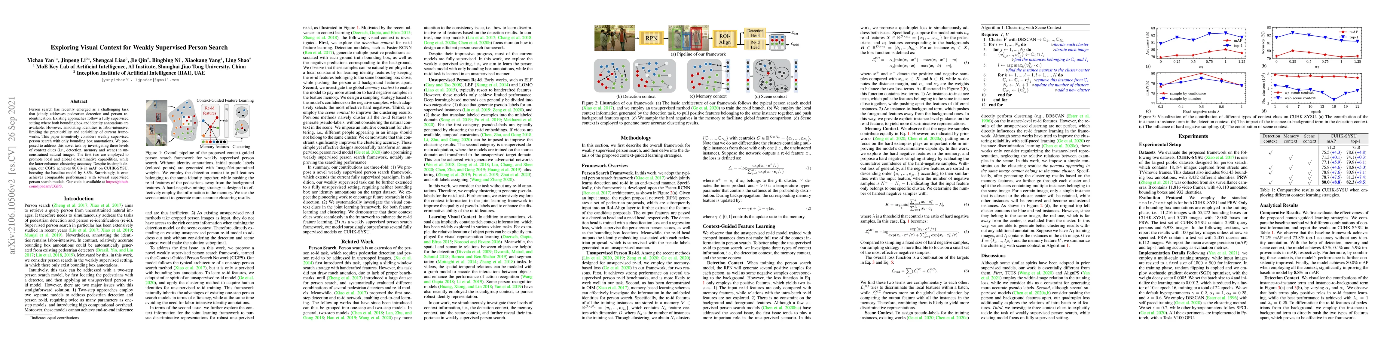 This paper proposes a weakly supervised approach for person search using only bounding box annotations, leveraging context clues at detection, memory, and scene levels to enhance discriminative and clustering capabilities. The CGPS model achieves 80.0% mAP on CUHK-SYSU, outperforming the baseline by 8.8% and rivaling several supervised methods.
