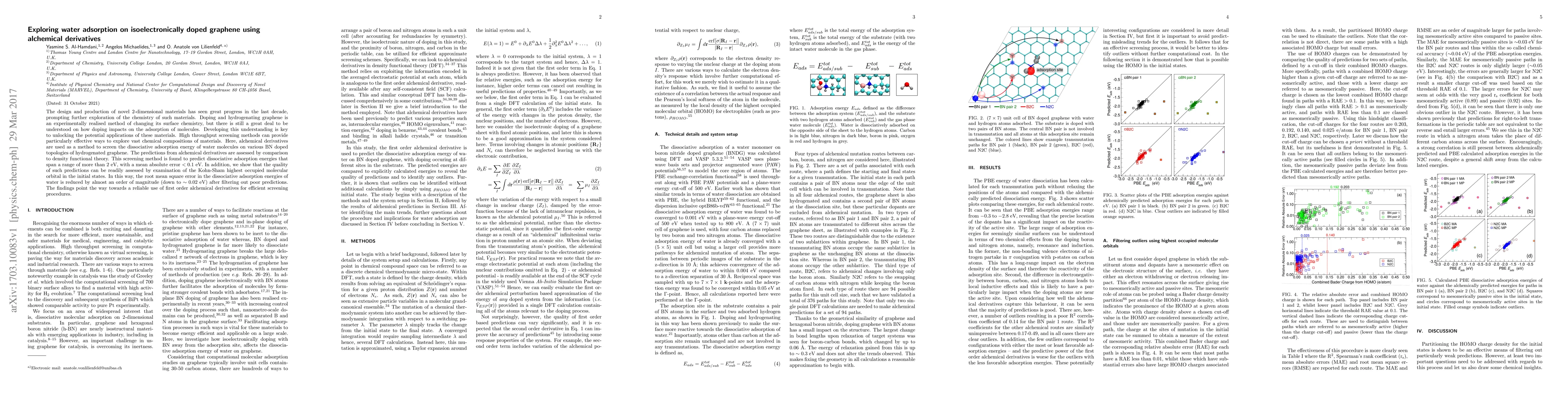 The design and production of novel 2-dimensional materials has seen great progress in the last decade, prompting further exploration of the chemistry of such materials. Doping and hydrogenating graphene is an experimentally realised method of changing its surface chemistry, but there is still a great deal to be understood on how doping impacts on the adsorption of molecules. Developing this understanding is key to unlocking the potential applications of these materials. High throughput screening methods can provide particularly effective ways to explore vast chemical compositions of materials. Here, alchemical derivatives are used as a method to screen the dissociative adsorption energy of water molecules on various BN doped topologies of hydrogenated graphene. The predictions from alchemical derivatives are assessed by comparison to density functional theory. This screening method is found to predict dissociative adsorption energies that span a range of more than 2 eV, with a mean absolute error $<0.1$ eV. In addition, we show that the quality of such predictions can be readily assessed by examination of the Kohn-Sham highest occupied molecular orbital in the initial states. In this way, the root mean square error in the dissociative adsorption energies of water is reduced by almost an order of magnitude (down to $\sim0.02$ eV) after filtering out poor predictions. The findings point the way towards a reliable use of first order alchemical derivatives for efficient screening procedures.
