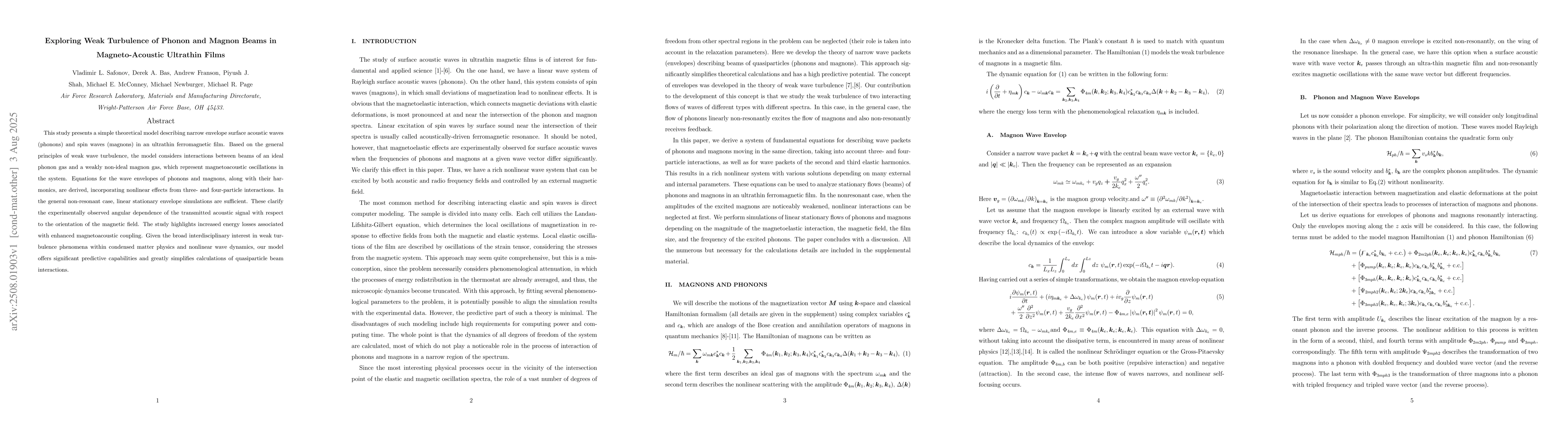 This study presents a simple theoretical model describing narrow envelope surface acoustic waves (phonons) and spin waves (magnons) in an ultrathin ferromagnetic film. Based on the general principles of weak wave turbulence, the model considers interactions between beams of an ideal phonon gas and a weakly non-ideal magnon gas, which represent magnetoacoustic oscillations in the system. Equations for the wave envelopes of phonons and magnons, along with their harmonics, are derived, incorporating nonlinear effects from three- and four-particle interactions. In the general non-resonant case, linear stationary envelope simulations are sufficient. These clarify the experimentally observed angular dependence of the transmitted acoustic signal with respect to the orientation of the magnetic field. The study highlights increased energy losses associated with enhanced magnetoacoustic coupling. Given the broad interdisciplinary interest in weak turbulence phenomena within condensed matter physics and nonlinear wave dynamics, our model offers significant predictive capabilities and greatly simplifies calculations of quasiparticle beam interactions.