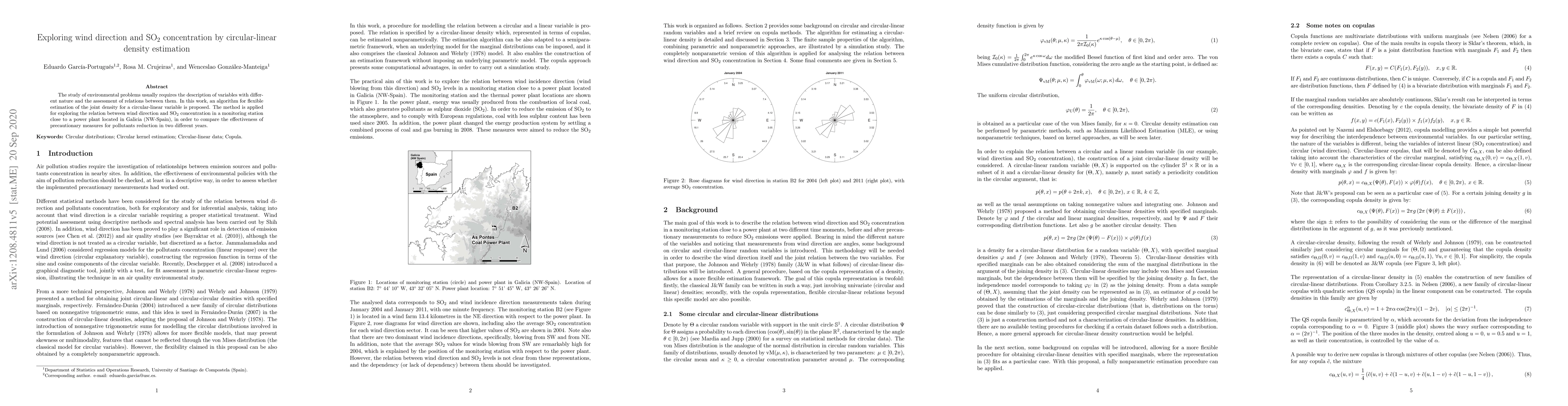 The study of environmental problems usually requires the description of variables with different nature and the assessment of relations between them. In this work, an algorithm for flexible estimation of the joint density for a circular-linear variable is proposed. The method is applied for exploring the relation between wind direction and SO2 concentration in a monitoring station close to a power plant located in Galicia (NW-Spain), in order to compare the effectiveness of precautionary measures for pollutants reduction in two different years.