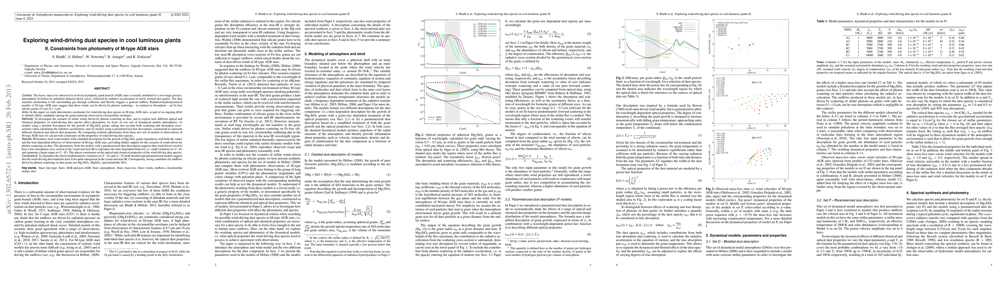 The heavy mass loss observed in evolved asymptotic giant branch (AGB) stars is usually attributed to a two-stage process: atmospheric levitation by pulsation-induced shock waves, followed by radiative acceleration of newly formed dust grains. The dust transfers momentum to the surrounding gas through collisions and thereby triggers a general outflow. Radiation-hydrodynamical models of M-type AGB stars suggest that these winds can be driven by photon scattering -- in contrast to absorption -- on Fe-free silicate grains of sizes 0.1--1\,$\mu$m. In this paper we study photometric constraints for wind-driving dust species in M-type AGB stars, as part of an ongoing effort to identify likely candidates among the grain materials observed in circumstellar envelopes. To investigate the scenario of stellar winds driven by photon scattering on dust, and to explore how different optical and chemical properties of wind-driving dust species affect photometry we focus on two sets of dynamical models atmospheres: (i) models using a detailed description for the growth of Mg$_2$SiO$_4$ grains, taking into account both scattering and absorption cross-sections when calculating the radiative acceleration, and (ii) models using a parameterized dust description, constructed to represent different chemical and optical dust properties. By comparing synthetic photometry from these two sets of models to observations of M-type AGB stars we can provide constraints on the properties of wind-driving dust species. Photometry from wind models with a detailed description for the growth of Mg$_2$SiO$_4$ grains reproduces well both the values and the time-dependent behavior of observations of M-type AGB stars, providing further support for the scenario of winds driven by photon scattering on dust.