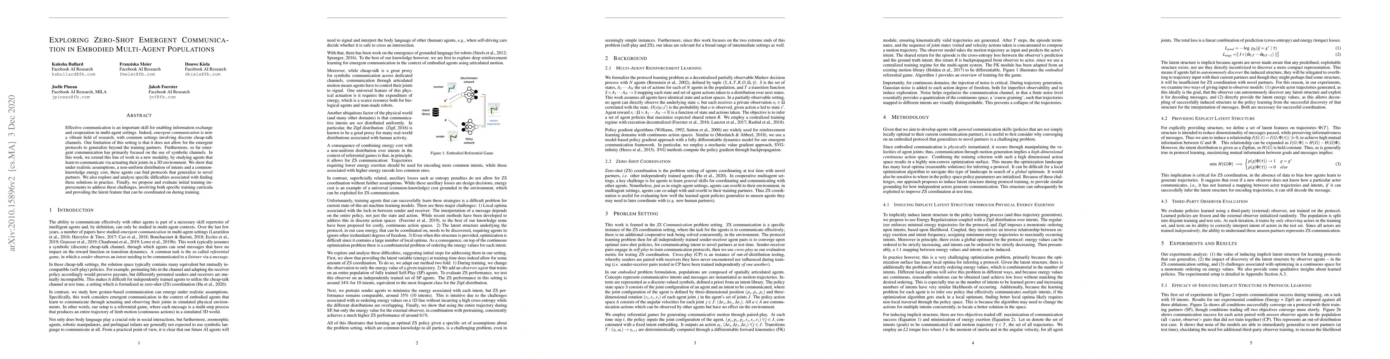 This paper investigates zero-shot emergent communication in embodied multi-agent populations, focusing on agents that communicate by actuating their joints in a 3D environment. It demonstrates that under realistic conditions, these agents can develop communication protocols that generalize beyond the training set, addressing limitations of previous symbolic communication research.