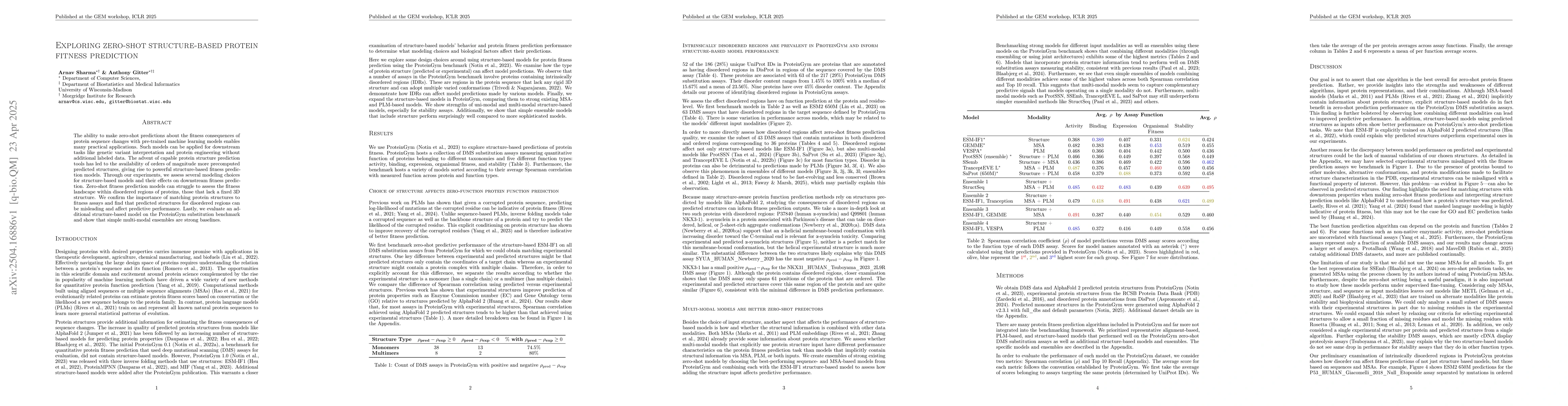The study explores zero-shot structure-based protein fitness prediction using various modeling choices and their impact on downstream fitness prediction. It assesses the performance of different models, including VESPA, GEMME, ESM-Inverse Folding, ProtSSN, TranceptEVEL, SSEmb, SaProt, ESM2650M, and various ensembles, on a comprehensive dataset called ProteinGym. The research also investigates the models' performance on proteins with disordered regions.