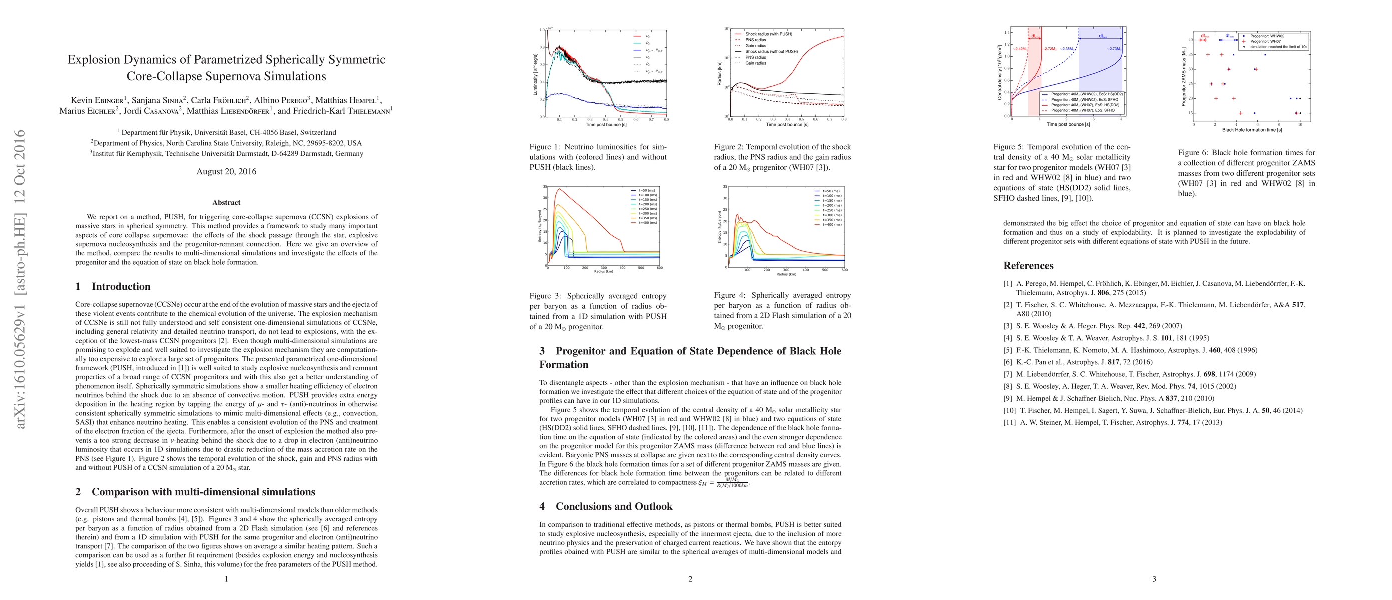 This paper introduces PUSH, a method for triggering core-collapse supernova explosions in spherically symmetric simulations, examining shock passage effects, nucleosynthesis, and black hole formation. It compares results to multi-dimensional simulations and analyzes the impact of progenitor characteristics and equation of state.