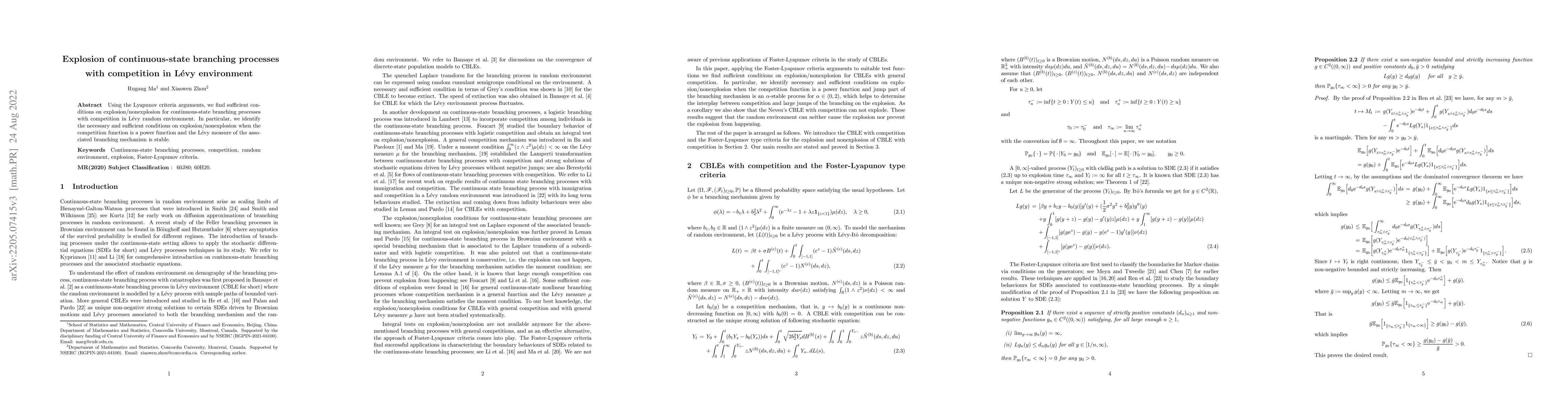 Summary: This paper employs Lyapunov criteria to determine conditions for explosion or nonexplosion in continuous-state branching processes with competition in a Lévy environment, identifying necessary and sufficient conditions for power competition functions and stable Lévy measures.