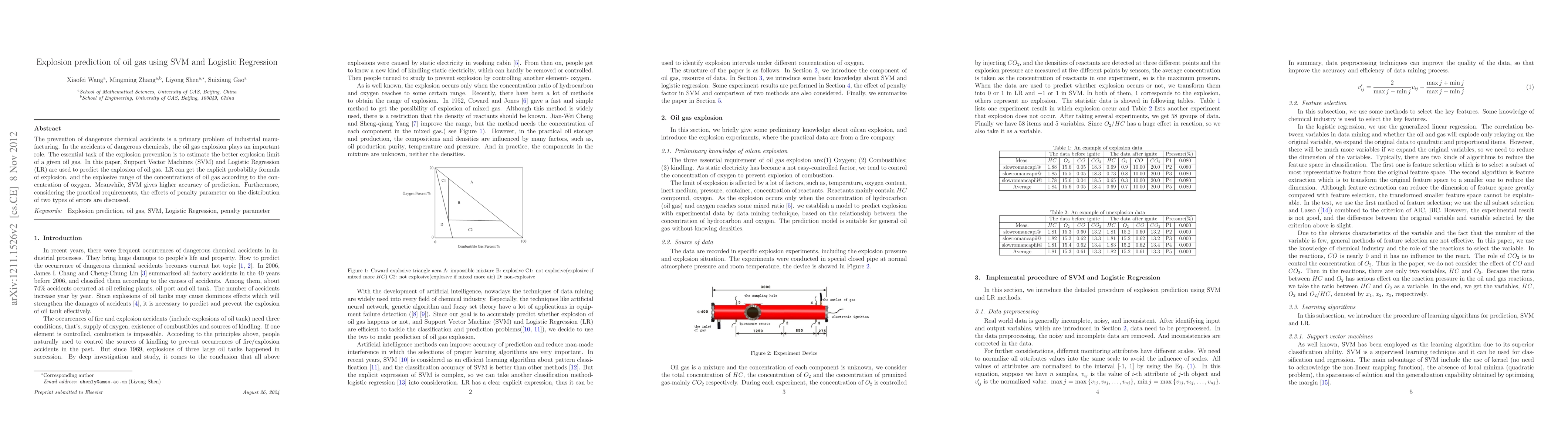 This paper explores the use of Support Vector Machines (SVM) and Logistic Regression (LR) to predict oil gas explosions, with LR providing explicit probability formulas and SVM achieving higher prediction accuracy. The study also examines the impact of the penalty parameter on error distribution in practical applications.