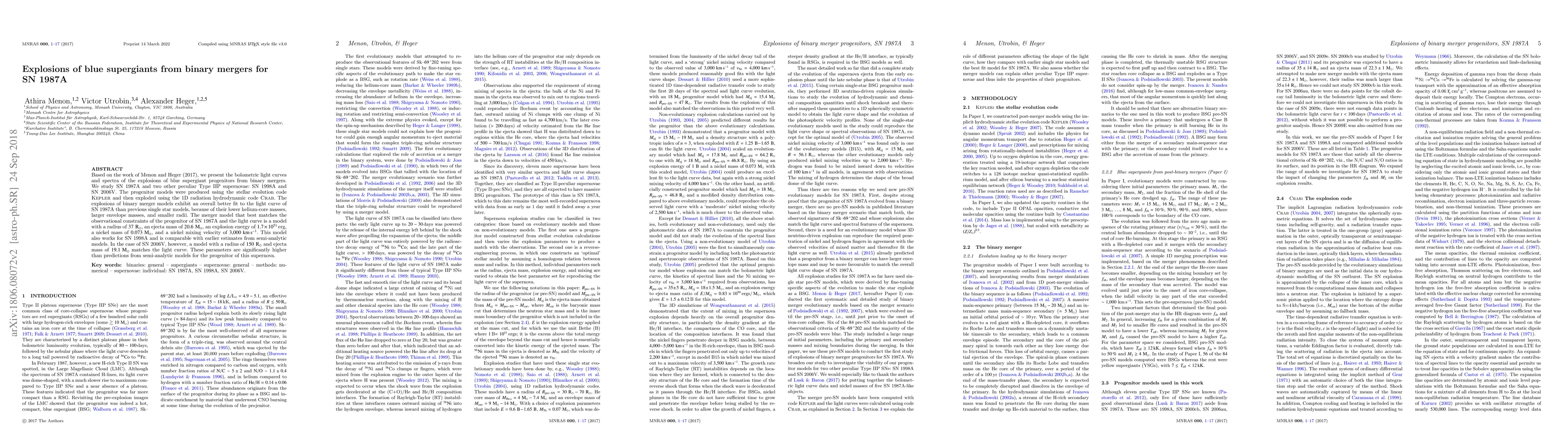 This paper explores the explosions of blue supergiants from binary mergers, focusing on SN 1987A and two other peculiar Type IIP supernovae. The study finds that binary merger models better fit the light curve of SN 1987A due to their lower helium-core masses and larger envelope masses compared to single star models.