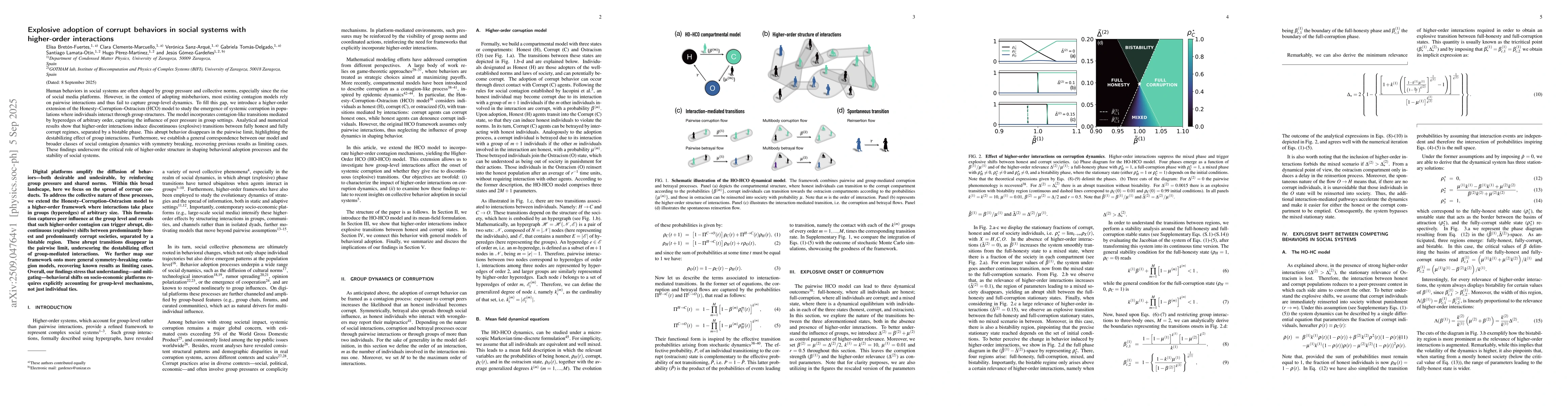 Human behaviors in social systems are often shaped by group pressure and collective norms, especially since the rise of social media platforms. However, in the context of adopting misbehaviors, most existing contagion models rely on pairwise interactions and thus fail to capture group-level dynamics. To fill this gap, we introduce a higher-order extension of the Honesty-Corruption-Ostracism (HCO) model to study the emergence of systemic corruption in populations where individuals interact through group structures. The model incorporates contagion-like transitions mediated by hyperedges of arbitrary order, capturing the influence of peer pressure in group settings. Analytical and numerical results show that higher-order interactions induce discontinuous (explosive) transitions between fully honest and fully corrupt regimes, separated by a bistable phase. This abrupt behavior disappears in the pairwise limit, highlighting the destabilizing effect of group interactions. Furthermore, we establish a general correspondence between our model and broader classes of social contagion dynamics with symmetry breaking, recovering previous results as limiting cases. These findings underscore the critical role of higher-order structure in shaping behavioral adoption processes and the stability of social systems.