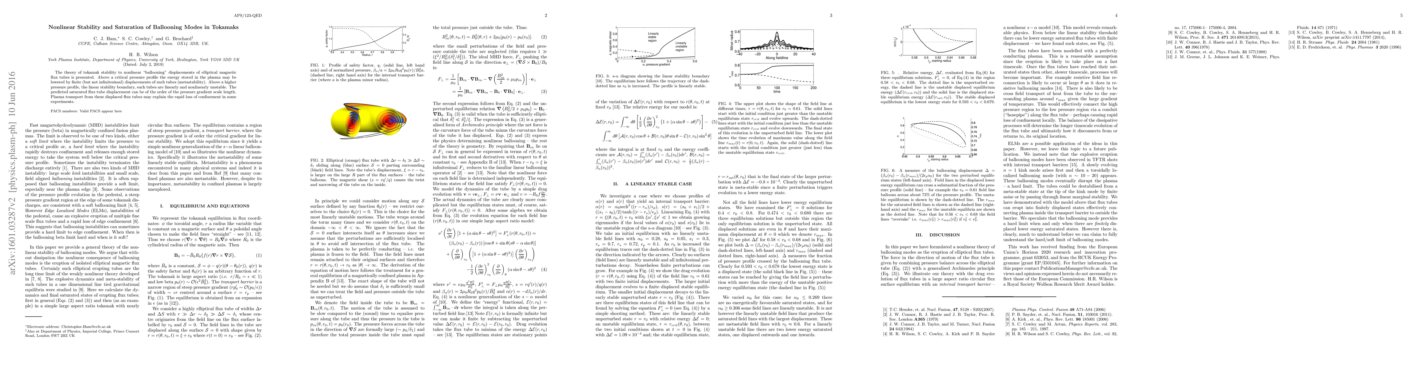 This paper investigates the stability of Tokamak plasmas against explosive ballooning displacements of elliptical magnetic flux tubes, finding that above certain pressure gradients, these tubes can undergo metastable or unstable displacements leading to significant plasma transport and rapid confinement loss.