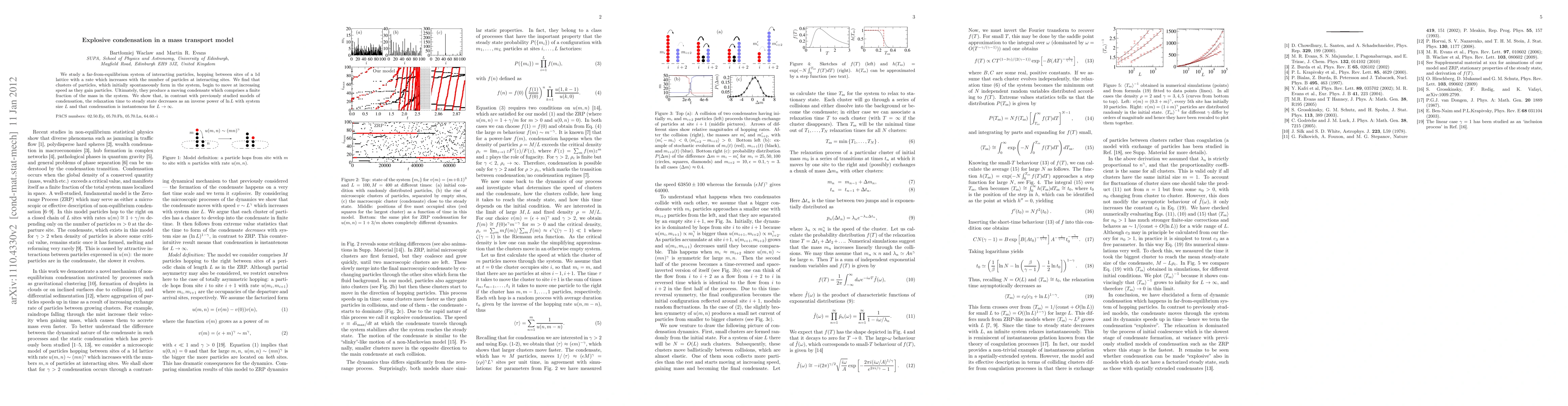 This paper investigates a far-from-equilibrium particle system on a 1D lattice where particle hopping rates increase with local density, leading to explosive condensation. The study reveals that particle clusters accelerate as they grow, forming a moving condensate that eventually comprises a finite fraction of the system's mass, with relaxation time decreasing inversely with the logarithm of the system size.
