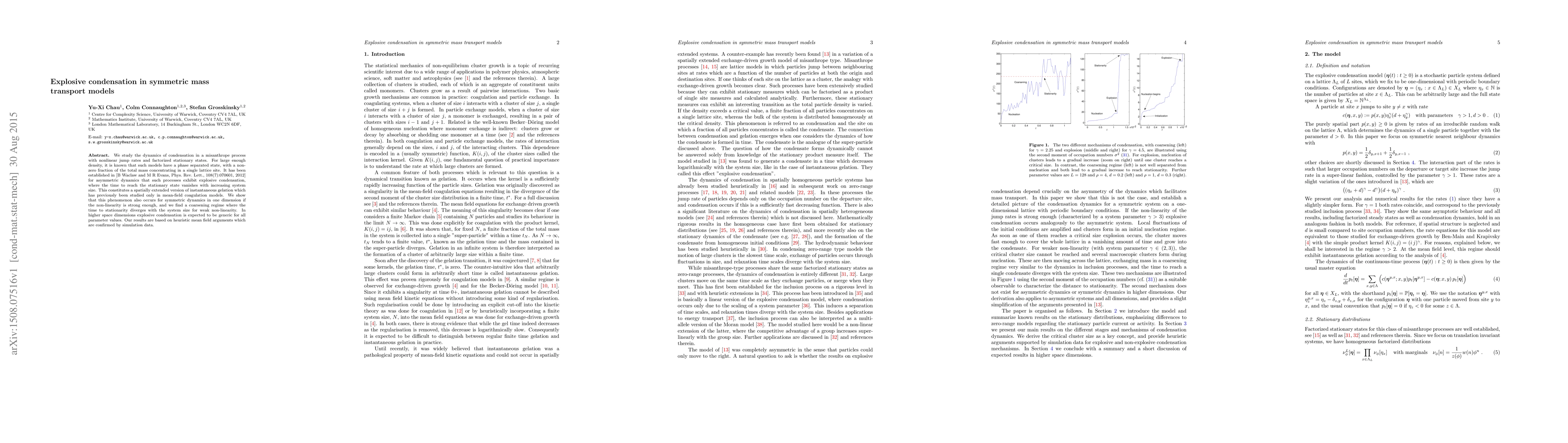 This paper explores the dynamics of condensation in symmetric mass transport models, demonstrating that explosive condensation occurs in one dimension for sufficiently strong non-linearity, while a coarsening regime is observed for weak non-linearity. Simulation data supports the findings, suggesting explosive condensation is likely generic in higher dimensions.