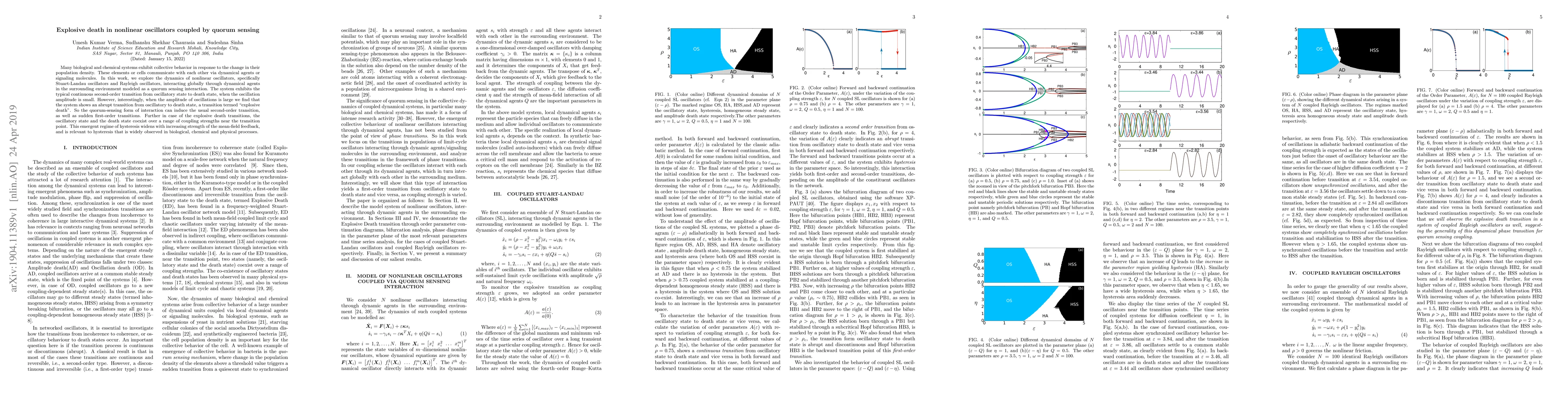 This paper investigates the dynamics of nonlinear oscillators, specifically Stuart-Landau and Rayleigh oscillators, coupled via quorum sensing interactions. The study reveals an "explosive death" transition, where large oscillation amplitudes lead to a sudden shift from oscillatory to death state, alongside a coexistence regime of both states near the transition point.