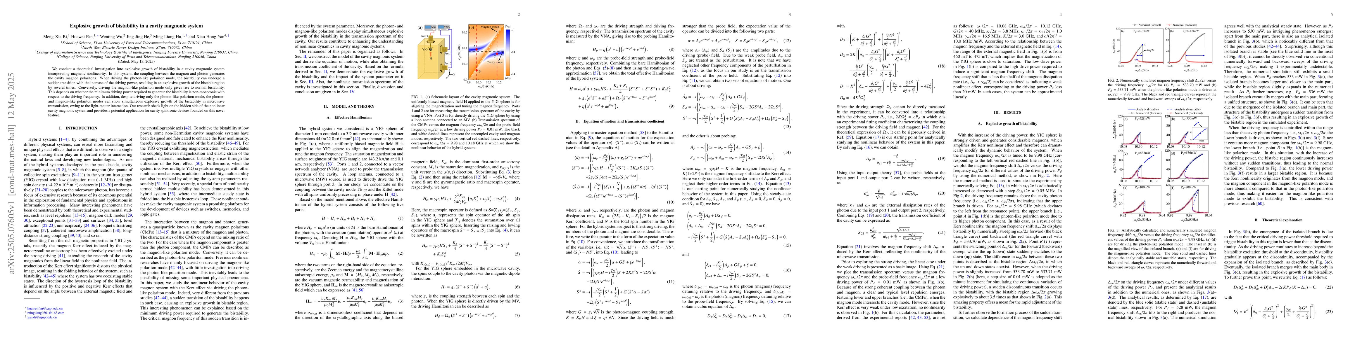 Theoretical investigation into explosive growth of bistability in a cavity magnonic system incorporating magnetic nonlinearity, focusing on the coupling between magnon and photon generating cavity magnon polaritons.