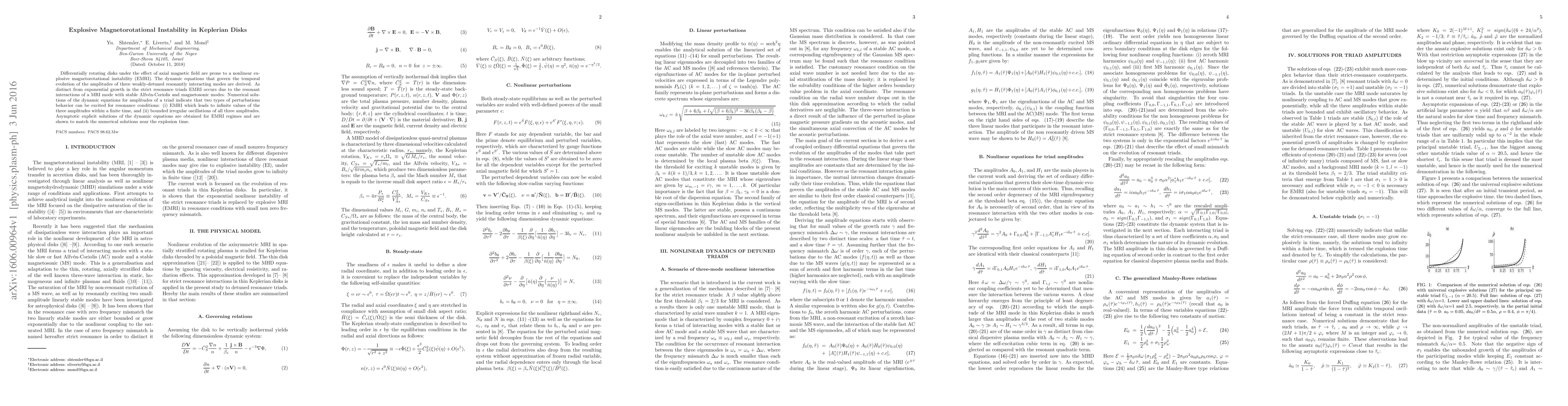 This paper investigates the explosive magnetorotational instability (EMRI) in differentially rotating disks under axial magnetic fields, deriving dynamic equations for three resonantly interacting modes. It reveals two types of perturbation behaviors: explosive growth leading to infinite amplitudes in finite time, and bounded irregular oscillations.