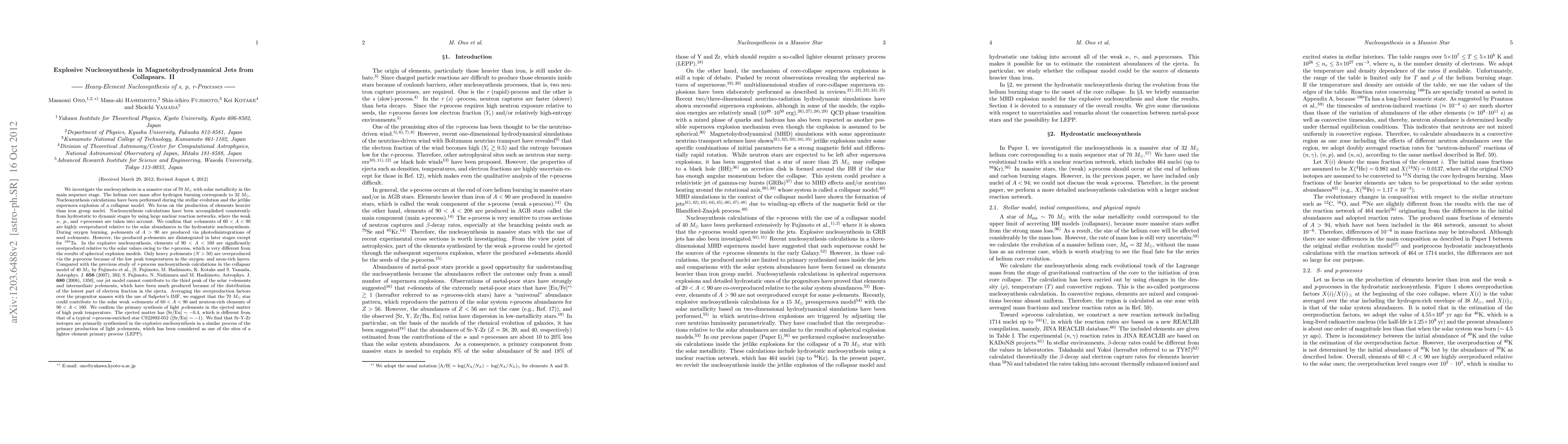 We investigate the nucleosynthesis in a massive star of 70 M_solar with solar metallicity in the main sequence stage. The helium core mass after hydrogen burning corresponds to 32 M_solar. Nucleosynthesis calculations have been performed during the stellar evolution and the jetlike supernova explosion of a collapsar model, where the weak s-, p-, and r-processes are taken into account. We confirm that s-elements of 60 < A < 90 are highly overproduced relative to the solar abundances in the hydrostatic nucleosynthesis. During oxygen burning, p-elements of A > 90 are produced via photodisintegrations of seed s-elements. However, the produced p-elements are disintegrated in later stages except for ^{180}Ta. In the explosive nucleosynthesis, elements of 90 < A < 160 are significantly overproduced relative to the solar values owing to the r-process. Only heavy p-elements (N > 50) are overproduced via the p-process. Compared with the previous study of r-process nucleosynthesis calculations in the collapsar model of 40 M_solar by Fujimoto et al. 2007, 2008, our jet model cannot contribute to the third peak of the solar r-elements and intermediate p-elements. Averaging the overproduction factors over the progenitor masses with the use of Salpeter's IMF, we suggest that the 70 M_solar star could contribute to the solar weak s-elements of 60 < A < 90 and neutron-rich elements of 90 < A < 160. We confirm the primary synthesis of light p-elements in the ejected matter of high peak temperature. The ejected matter has [Sr/Eu] \sim -0.4, which is different from that of a typical r-process-enriched star CS22892-052 ([Sr/Eu] \sim -1). We find that Sr-Y-Zr isotopes are primarily synthesized in the explosive nucleosynthesis in a similar process of the primary production of light p-elements, which has been considered as one of the sites of a lighter element primary process (LEPP).
