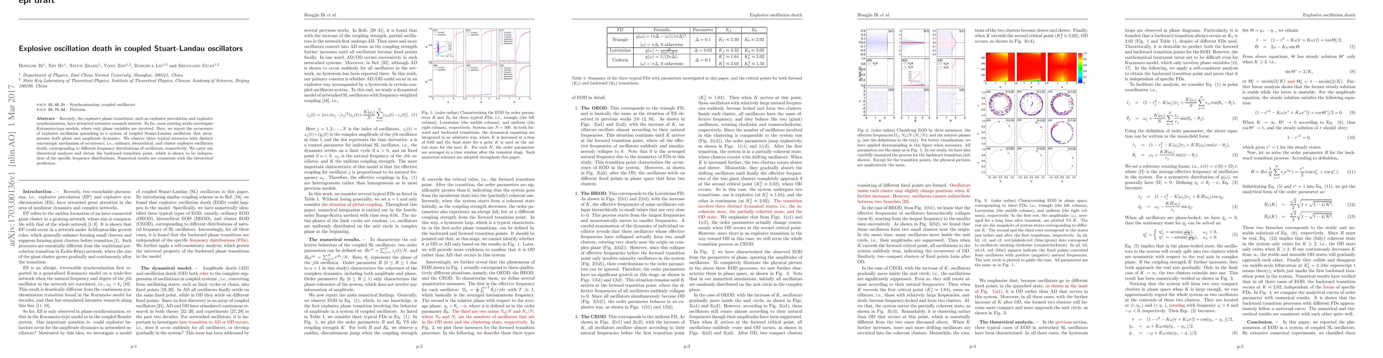This paper investigates explosive oscillation quenching in coupled Stuart-Landau oscillators, revealing three distinct scenarios of explosive death based on different frequency distributions. Theoretical analyses identify a backward transition point independent of frequency distributions, corroborated by numerical results.