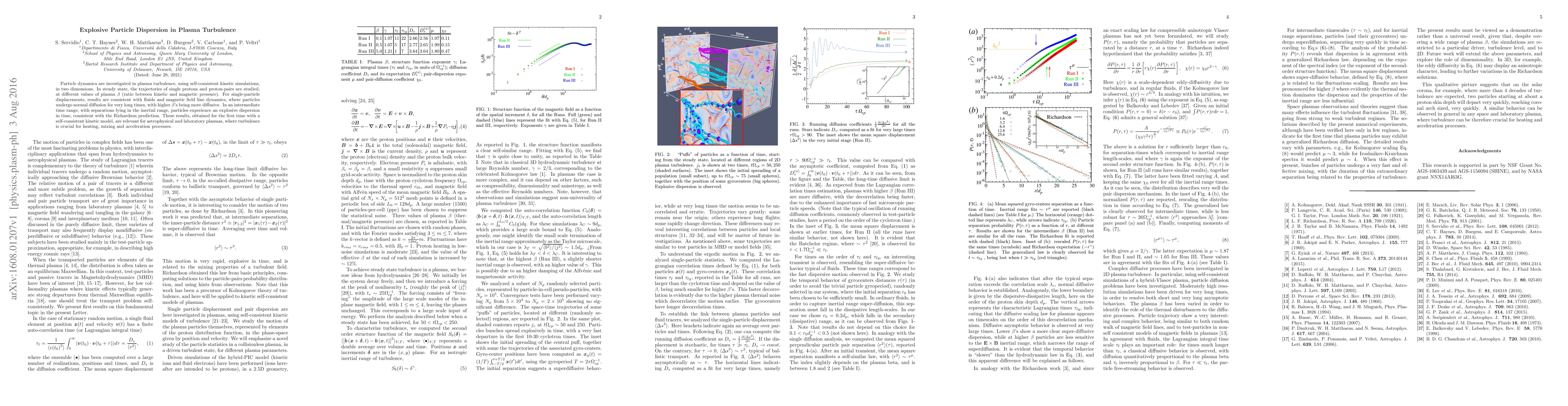 This study uses self-consistent kinetic simulations to investigate particle dynamics in plasma turbulence, revealing normal diffusion for long times and explosive dispersion in an intermediate time range, consistent with Richardson's prediction. These findings are significant for understanding heating, mixing, and acceleration processes in astrophysical and laboratory plasmas.