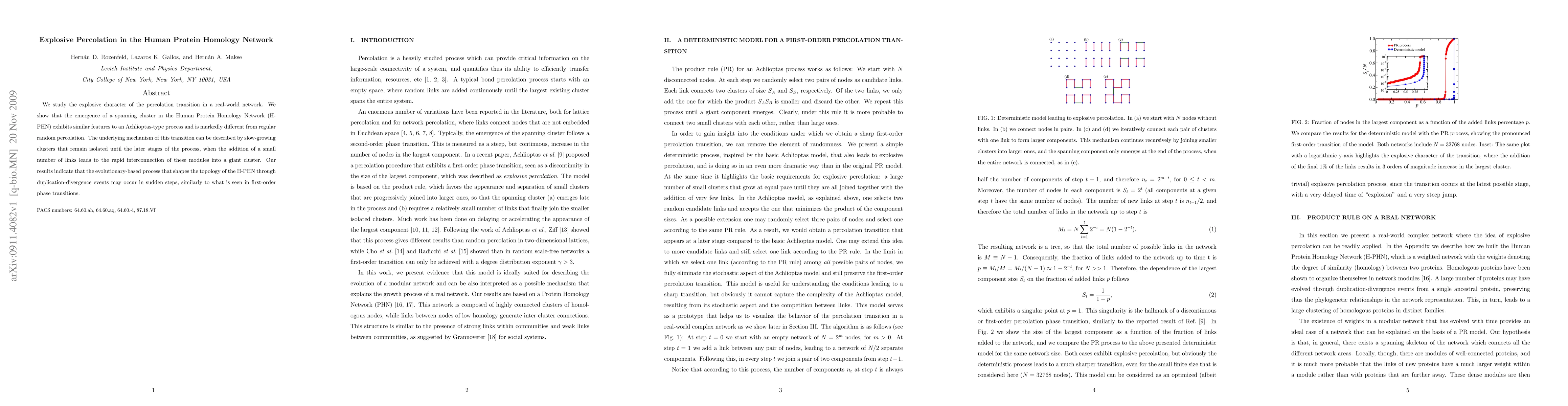 We study the explosive character of the percolation transition in a real-world network. We show that the emergence of a spanning cluster in the Human Protein Homology Network (H-PHN) exhibits similar features to an Achlioptas-type process and is markedly different from regular random percolation. The underlying mechanism of this transition can be described by slow-growing clusters that remain isolated until the later stages of the process, when the addition of a small number of links leads to the rapid interconnection of these modules into a giant cluster. Our results indicate that the evolutionary-based process that shapes the topology of the H-PHN through duplication-divergence events may occur in sudden steps, similarly to what is seen in first-order phase transitions.