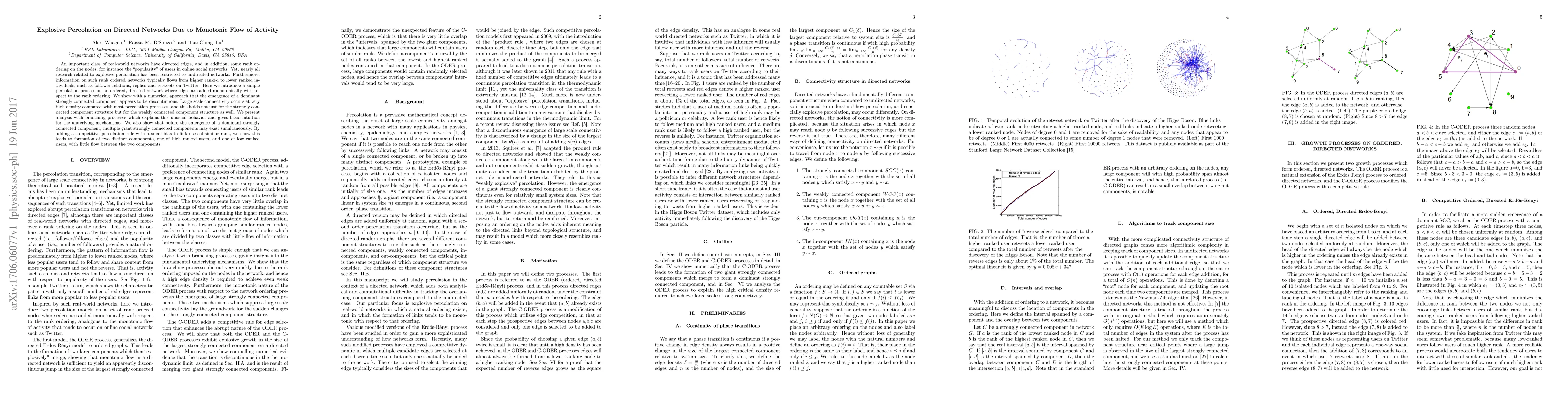 An important class of real-world networks have directed edges, and in addition, some rank ordering on the nodes, for instance the "popularity" of users in online social networks. Yet, nearly all research related to explosive percolation has been restricted to undirected networks. Furthermore, information on such rank ordered networks typically flows from higher ranked to lower ranked individuals, such as follower relations, replies and retweets on Twitter. Here we introduce a simple percolation process on an ordered, directed network where edges are added monotonically with respect to the rank ordering. We show with a numerical approach that the emergence of a dominant strongly connected component appears to be discontinuous. Large scale connectivity occurs at very high density compared with most percolation processes, and this holds not just for the strongly connected component structure but for the weakly connected component structure as well. We present analysis with branching processes which explains this unusual behavior and gives basic intuition for the underlying mechanisms. We also show that before the emergence of a dominant strongly connected component, multiple giant strongly connected components may exist simultaneously. By adding a competitive percolation rule with a small bias to link uses of similar rank, we show this leads to formation of two distinct components, one of high ranked users, and one of low ranked users, with little flow between the two components.