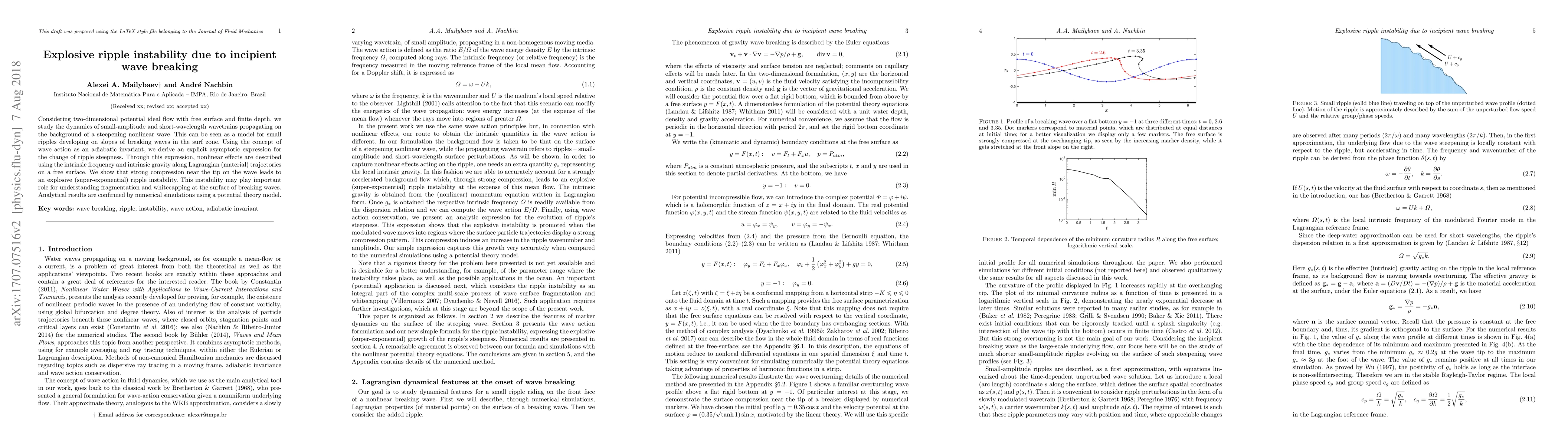 This paper investigates the explosive ripple instability caused by wave breaking in shallow water, modeling small ripples on breaking waves' slopes using ideal flow dynamics. It reveals a super-exponential instability driven by nonlinear effects, which is crucial for understanding the fragmentation and whitecapping phenomena in breaking waves, with results validated by numerical simulations.