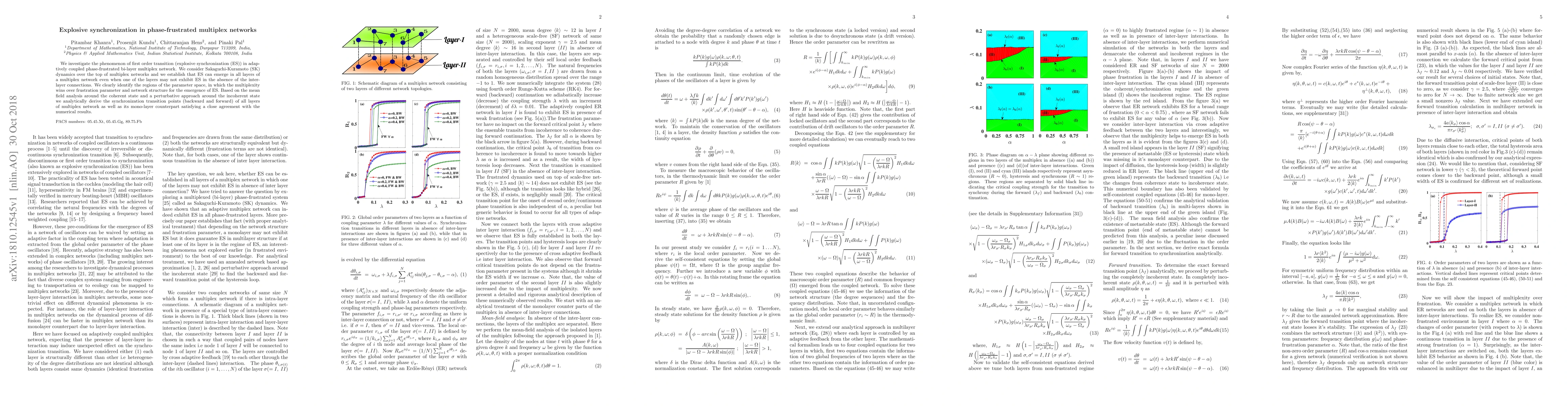This paper explores the first-order transition phenomenon known as explosive synchronization in adaptively coupled phase-frustrated bi-layer multiplex networks, demonstrating that interlayer connections can induce synchronization even in layers that do not exhibit it alone. Analytical and numerical methods reveal the parameter regions where multiplexity overcomes frustration for synchronization emergence.