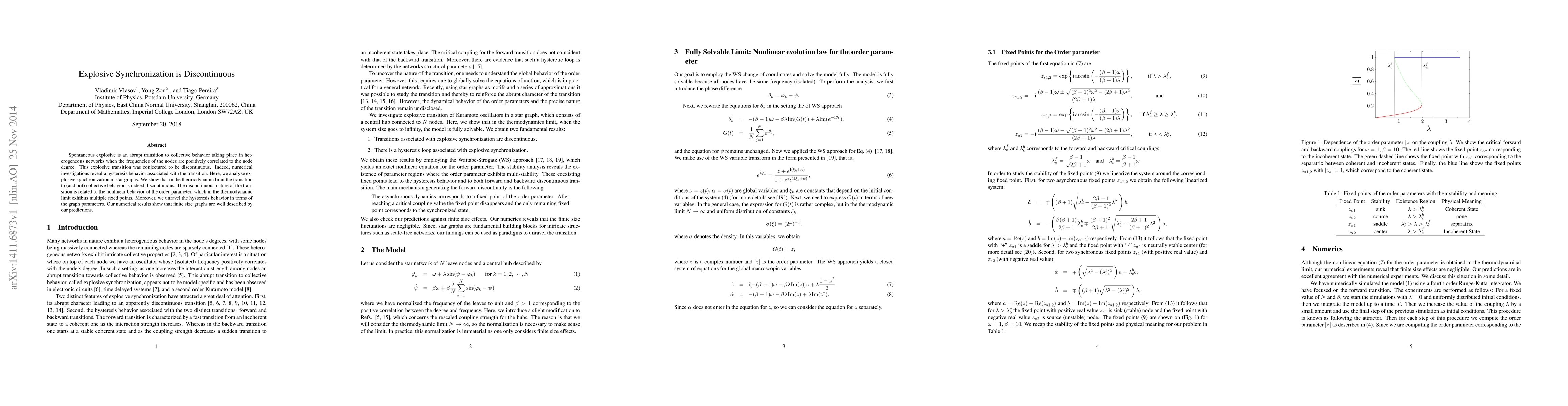 Spontaneous explosive is an abrupt transition to collective behavior taking place in heterogeneous networks when the frequencies of the nodes are positively correlated to the node degree. This explosive transition was conjectured to be discontinuous. Indeed, numerical investigations reveal a hysteresis behavior associated with the transition. Here, we analyze explosive synchronization in star graphs. We show that in the thermodynamic limit the transition to (and out) collective behavior is indeed discontinuous. The discontinuous nature of the transition is related to the nonlinear behavior of the order parameter, which in the thermodynamic limit exhibits multiple fixed points. Moreover, we unravel the hysteresis behavior in terms of the graph parameters. Our numerical results show that finite size graphs are well described by our predictions.