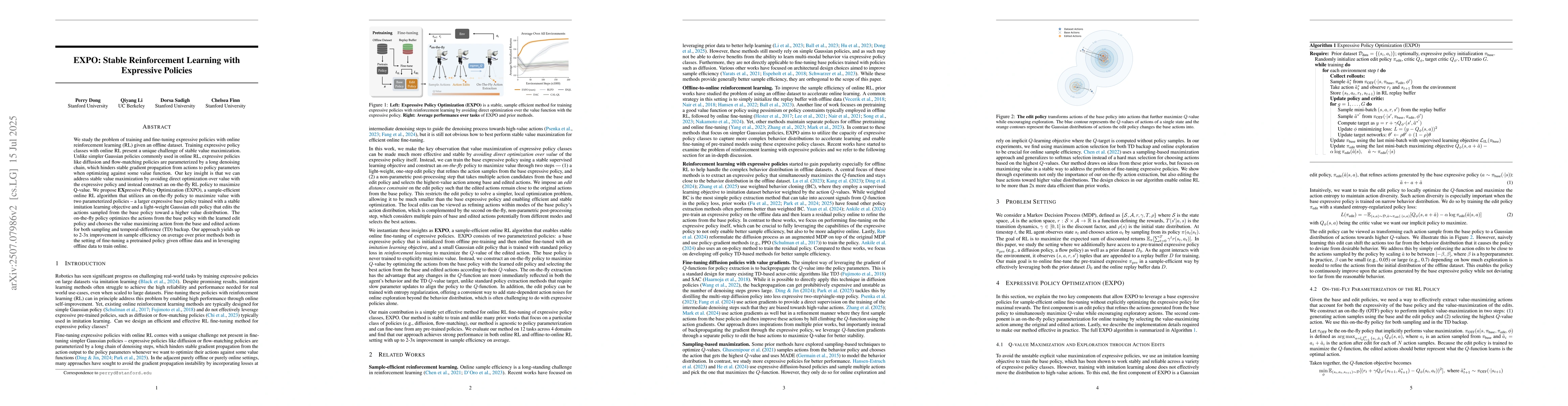 We study the problem of training and fine-tuning expressive policies with online reinforcement learning (RL) given an offline dataset. Training expressive policy classes with online RL present a unique challenge of stable value maximization. Unlike simpler Gaussian policies commonly used in online RL, expressive policies like diffusion and flow-matching policies are parameterized by a long denoising chain, which hinders stable gradient propagation from actions to policy parameters when optimizing against some value function. Our key insight is that we can address stable value maximization by avoiding direct optimization over value with the expressive policy and instead construct an on-the-fly RL policy to maximize Q-value. We propose Expressive Policy Optimization (EXPO), a sample-efficient online RL algorithm that utilizes an on-the-fly policy to maximize value with two parameterized policies -- a larger expressive base policy trained with a stable imitation learning objective and a light-weight Gaussian edit policy that edits the actions sampled from the base policy toward a higher value distribution. The on-the-fly policy optimizes the actions from the base policy with the learned edit policy and chooses the value maximizing action from the base and edited actions for both sampling and temporal-difference (TD) backup. Our approach yields up to 2-3x improvement in sample efficiency on average over prior methods both in the setting of fine-tuning a pretrained policy given offline data and in leveraging offline data to train online.