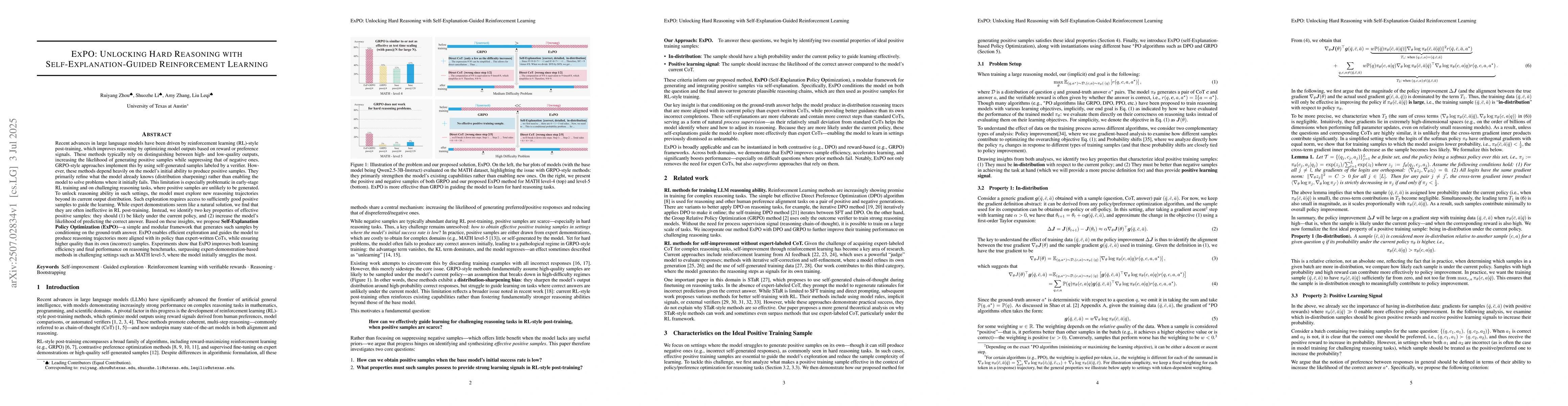 ExPO, a novel framework for generating in-distribution positive samples through self-explanation, integrated with DPO and GRPO for reinforcement learning in reasoning tasks.