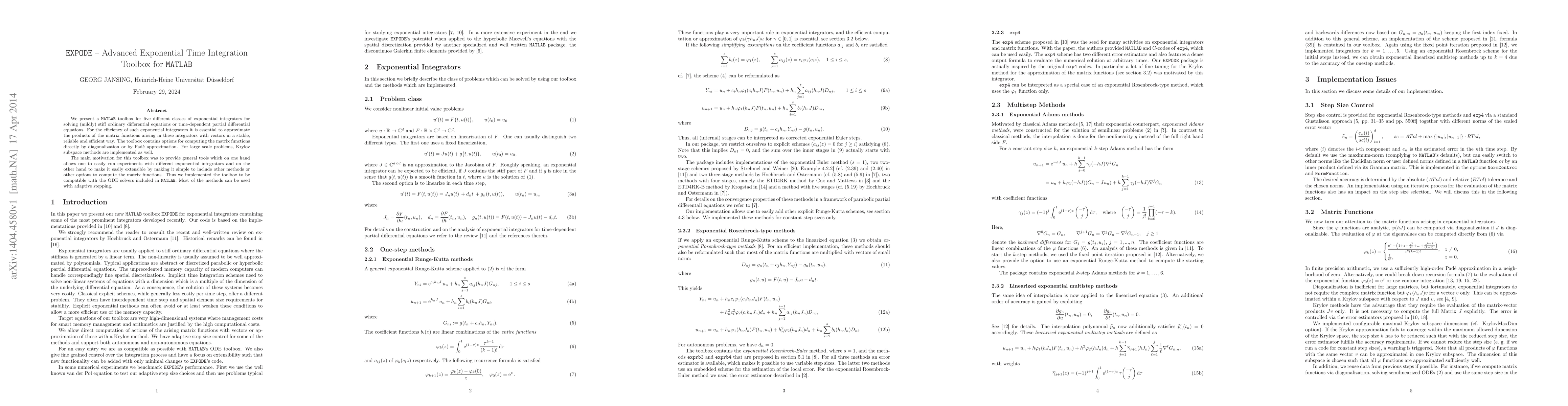 The EXPODE toolbox in MATLAB offers five classes of exponential integrators for solving stiff ODEs and PDEs, employing stable and efficient methods for matrix function approximations, including diagonalization, Pade approximation, and Krylov subspace techniques. It aims to facilitate experimentation and extension with compatibility to MATLAB's ODE solvers and adaptive stepping.