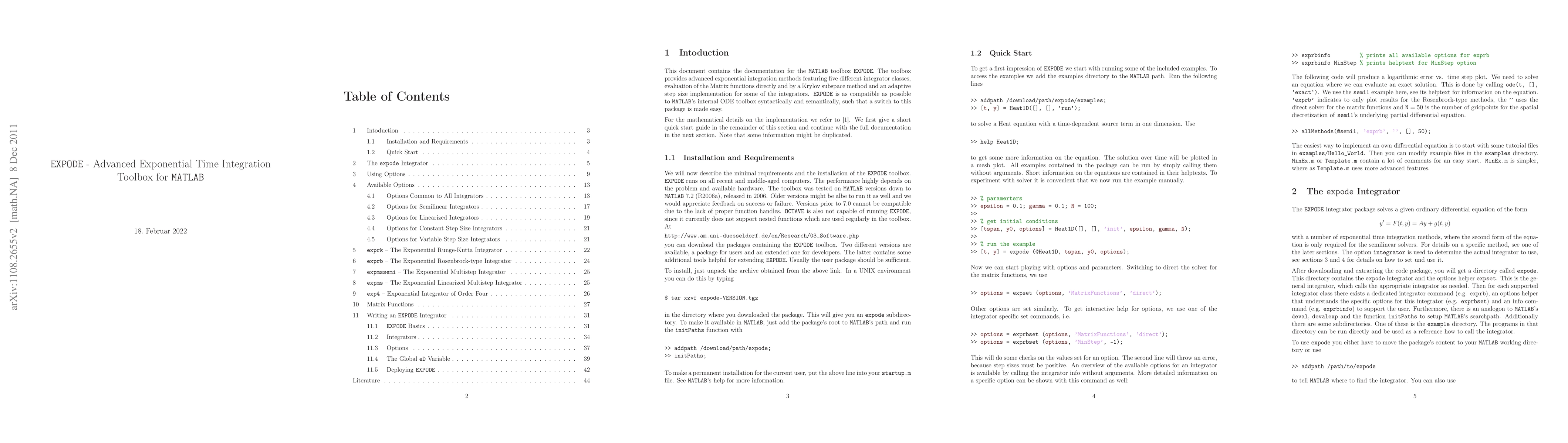 EXPODE is a MATLAB toolbox for advanced exponential time integration, supporting various methods including exponential Runge-Kutta, Rosenbrock, and multistep techniques. It offers adaptive step width control and matrix function evaluation via direct or Krylov methods. Documentation and software are available online.