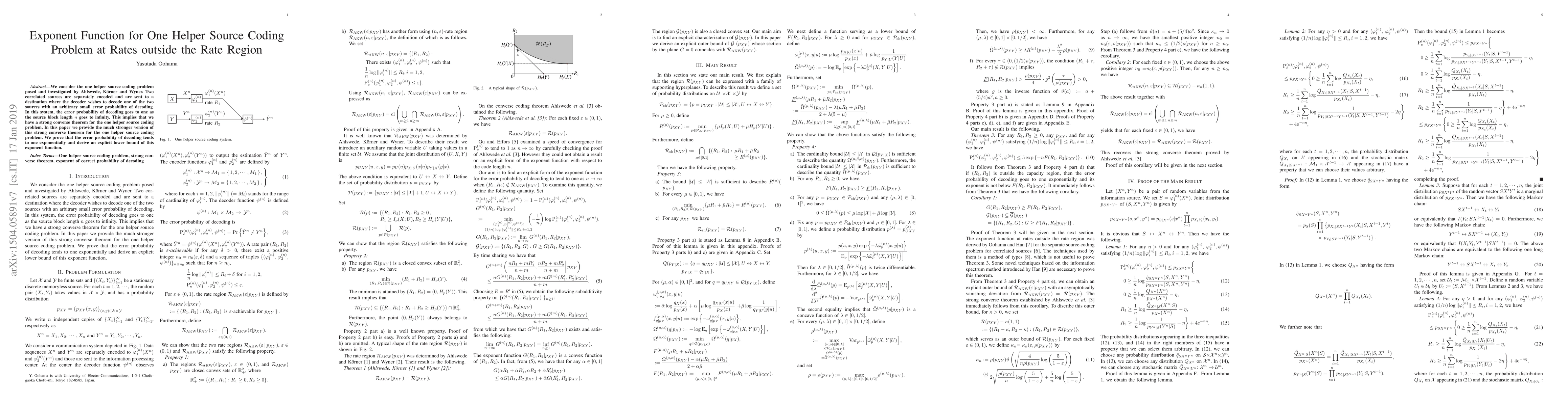 This paper strengthens the strong converse theorem for the one helper source coding problem, proving that decoding error probability tends to one exponentially as the source block length increases. An explicit lower bound for the exponent function governing this exponential decay is derived.