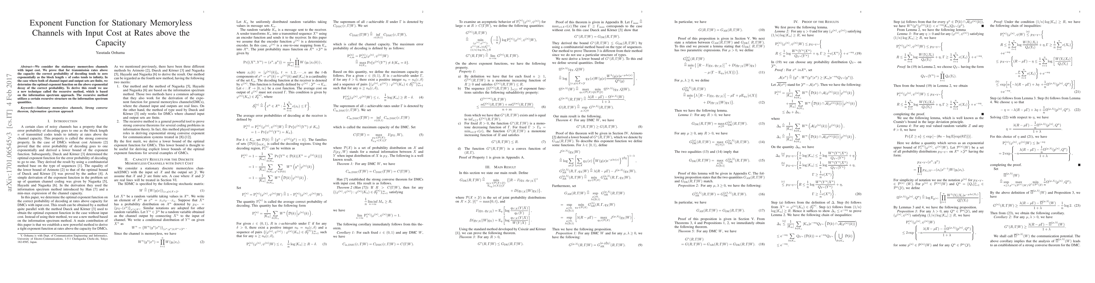 This paper investigates stationary memoryless channels with input cost, proving that for transmission rates above capacity, the probability of correct decoding decreases exponentially as code block length increases. It determines the optimal exponent function for this decay using a new recursive method based on the information spectrum approach.