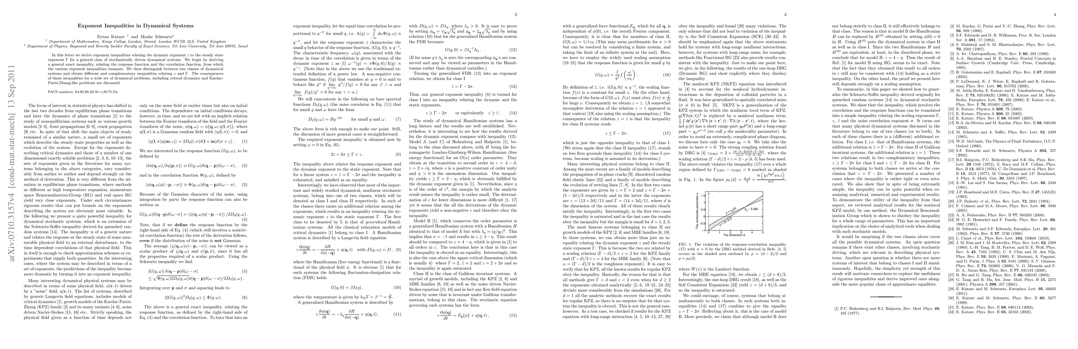 In this letter we derive exponent inequalities relating the dynamic exponent $z$ to the steady state exponent $\Gamma$ for a general class of stochastically driven dynamical systems. We begin by deriving a general exact inequality, relating the response function and the correlation function, from which the various exponent inequalities emanate. We then distinguish between two classes of dynamical systems and obtain different and complementary inequalities relating $z$ and $\Gamma$. The consequences of those inequalities for a wide set of dynamical problems, including critical dynamics and Kardar-Parisi-Zhang-like problems are discussed.