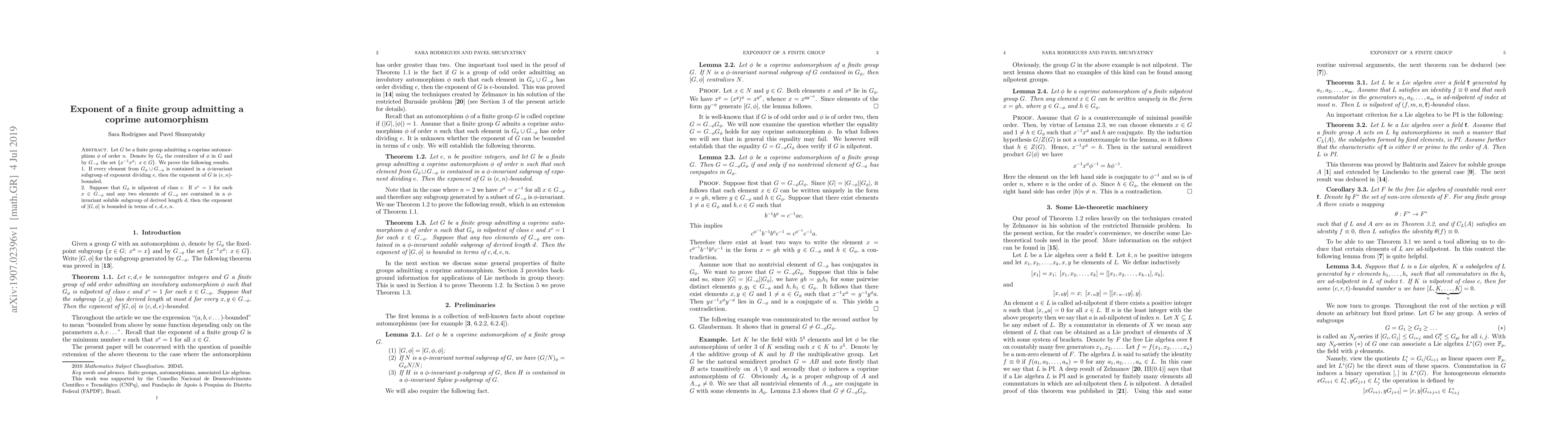 Let $G$ be a finite group admitting a coprime automorphism $\phi$ of order $n$. Denote by $G_{\phi}$ the centralizer of $\phi$ in $G$ and by $G_{-\phi}$ the set $\{ x^{-1}x^{\phi}; \ x\in G\}$. We prove the following results. 1. If every element from $G_{\phi}\cup G_{-\phi}$ is contained in a $\phi$-invariant subgroup of exponent dividing $e$, then the exponent of $G$ is $(e,n)$-bounded. 2. Suppose that $G_{\phi}$ is nilpotent of class $c$. If $x^{e}=1$ for each $x \in G_{-\phi}$ and any two elements of $G_{-\phi}$ are contained in a $\phi$-invariant soluble subgroup of derived length $d$, then the exponent of $[G,\phi]$ is bounded in terms of $c,d,e,n$.