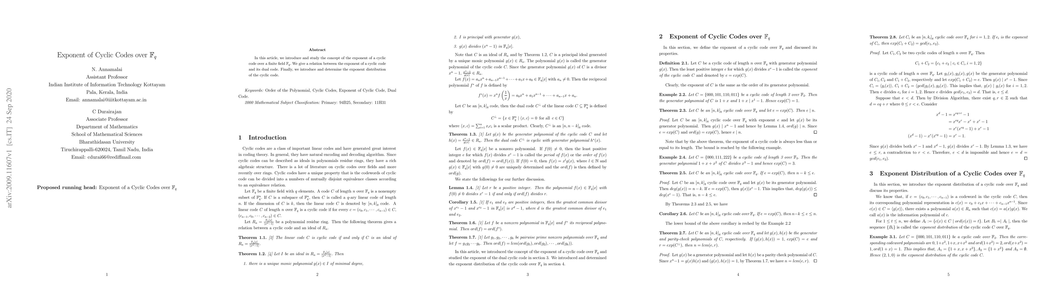 In this article, we introduce and study the concept of the exponent of a cyclic code over a finite field $\mathbb{F}_q.$ We give a relation between the exponent of a cyclic code and its dual code. Finally, we introduce and determine the exponent distribution of the cyclic code.
