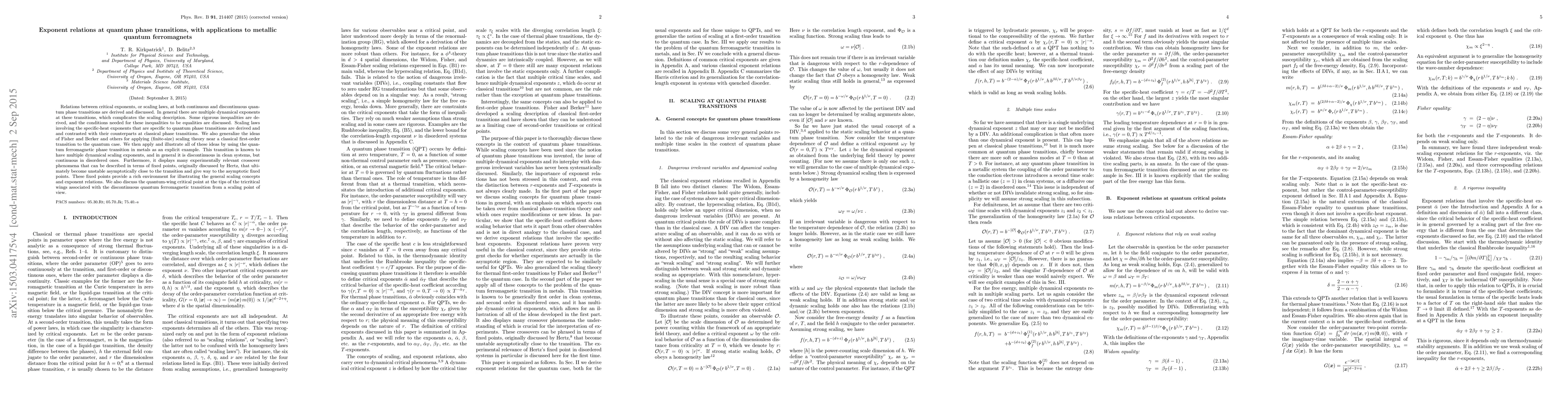 Relations between critical exponents, or scaling laws, at both continuous and discontinuous quantum phase transitions are derived and discussed. In general there are multiple dynamical exponents at these transitions, which complicates the scaling description. Some rigorous inequalities are derived, and the conditions needed for these inequalities to be equalities are discussed. New scaling laws involving the specific-heat exponents are derived and and contrasted with their counterparts at classical phase transitions. We also generalize the ideas of Fisher and Berker and others for applying (finite-size) scaling theory near a classical first-order transition to the quantum case. We then apply and illustrate all of these ideas by using the quantum ferromagnetic phase transition in metals as an explicit example. This transition is known to have multiple dynamical scaling exponents, and in general it is discontinuous in clean systems, but continuous in disordered ones. Furthermore, it displays many experimentally relevant crossover phenomena that can be described in terms of fixed points, originally discussed by Hertz, that ultimately become unstable asymptotically close to the transition and give way to the asymptotic fixed points. These fixed points provide a rich environment for illustrating the general scaling concepts and exponent relations. We also discuss the quantum-wing critical point at the tips of the tricritical wings associated with the discontinuous quantum ferromagnetic transition from a scaling point of view.