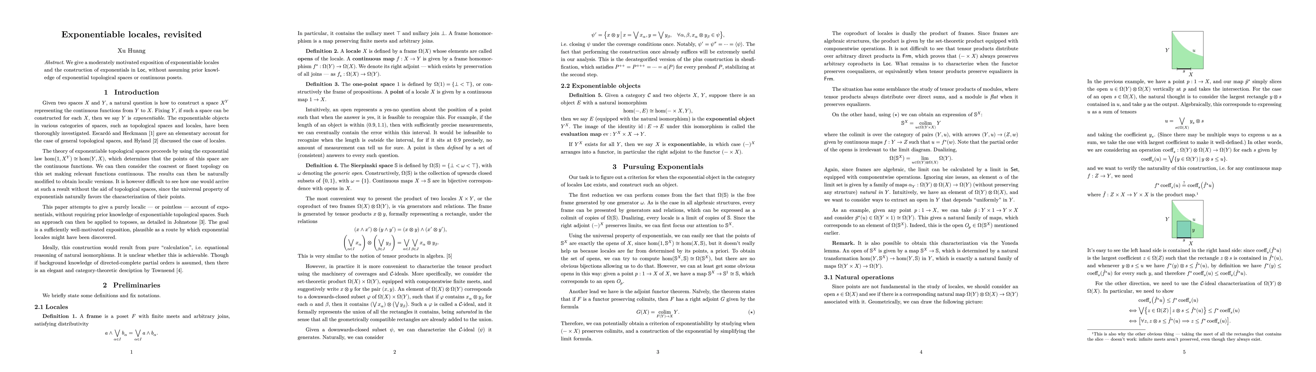 We give a moderately motivated exposition of exponentiable locales and the construction of exponentials in $\textsf{Loc}$, without assuming prior knowledge of exponential topological spaces or continuous posets.