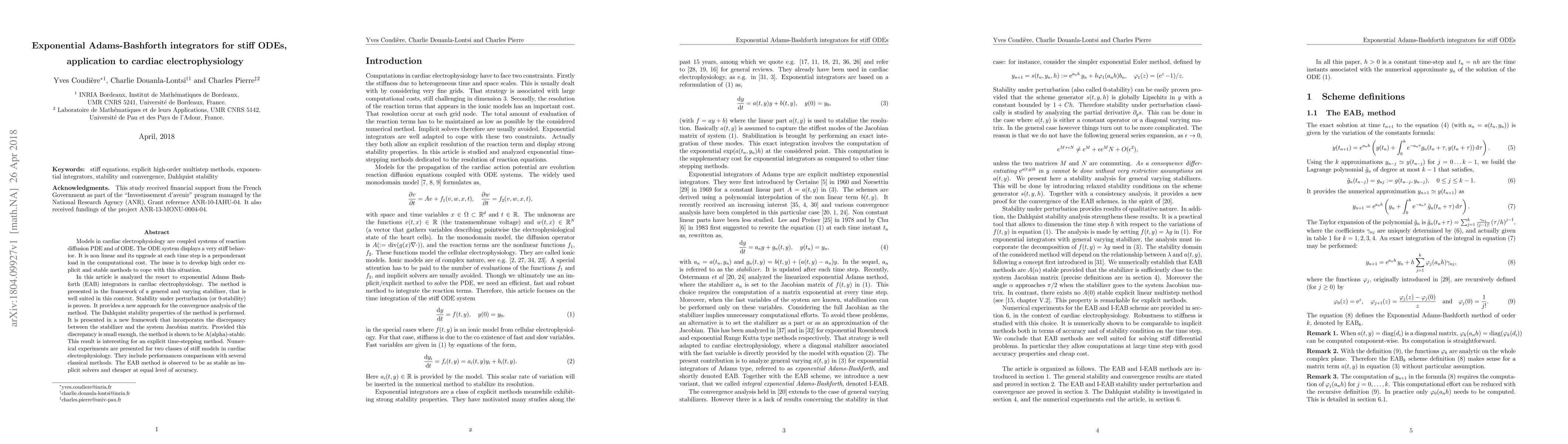 This paper explores the application of exponential Adams Bashforth (EAB) integrators to solve stiff ordinary differential equations (ODEs) in cardiac electrophysiology models. The proposed method is shown to be A(alpha)-stable under certain conditions, offering stability comparable to implicit solvers while maintaining computational efficiency.