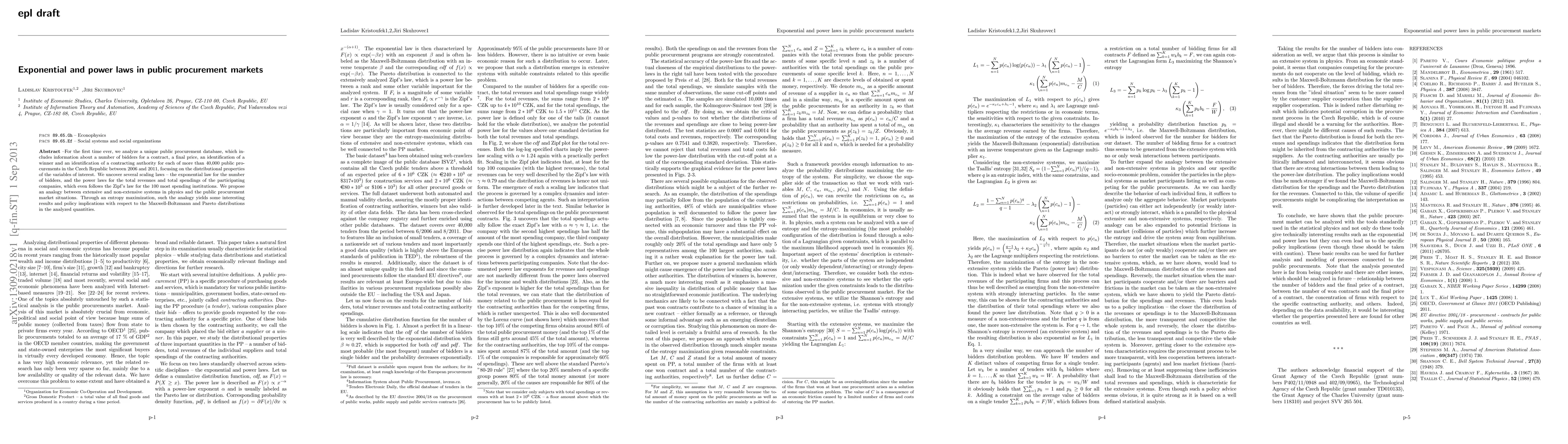 This paper analyzes a unique public procurement database from the Czech Republic, revealing exponential and power laws in the number of bidders and revenues, respectively. The findings suggest a parallel between physical systems and procurement markets, with implications for policy and distributional analysis.