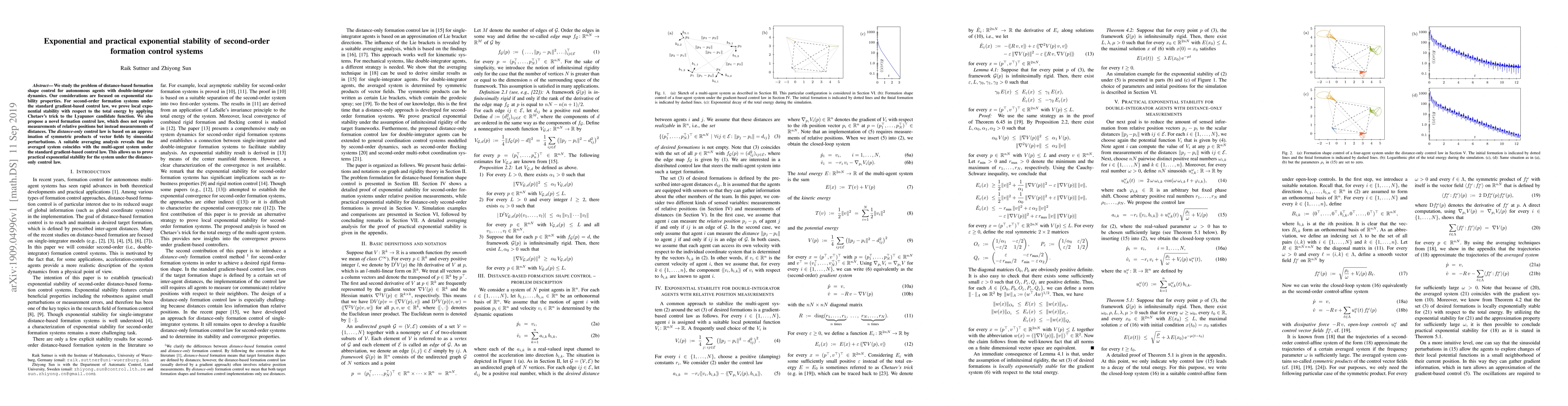 This paper investigates the exponential stability of second-order formation control systems for autonomous agents. It proves local exponential stability using Chetaev's trick and proposes a novel distance-only control law, demonstrating practical exponential stability through an averaging analysis.