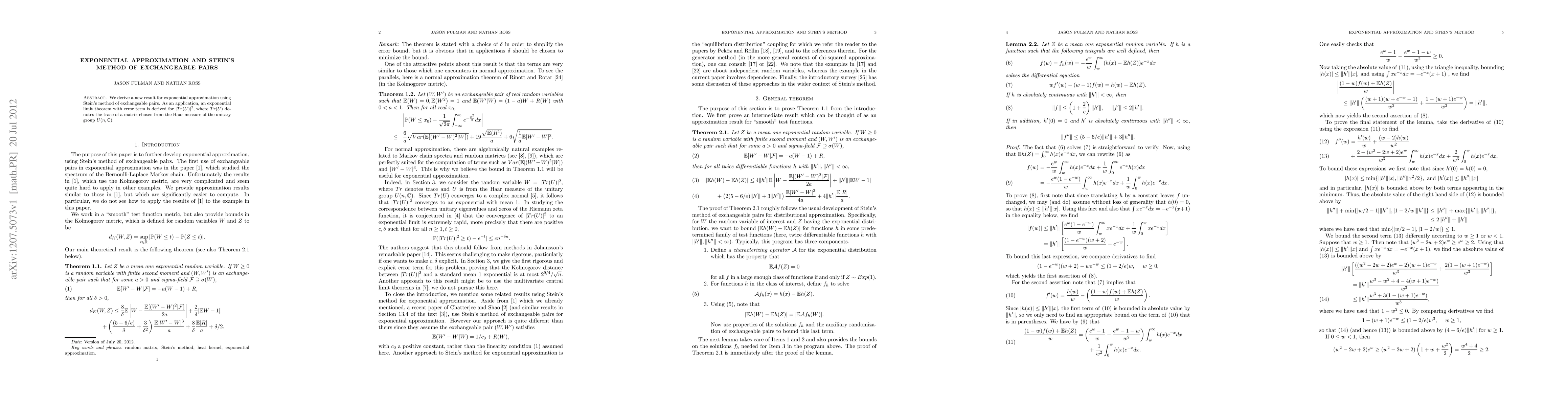 We derive a new result for exponential approximation using Stein's method of exchangeable pairs. As an application, an exponential limit theorem with error term is derived for |Tr(U)|^2, where Tr(U) denotes the trace of a matrix chosen from the Haar measure of the unitary group U(n,C).