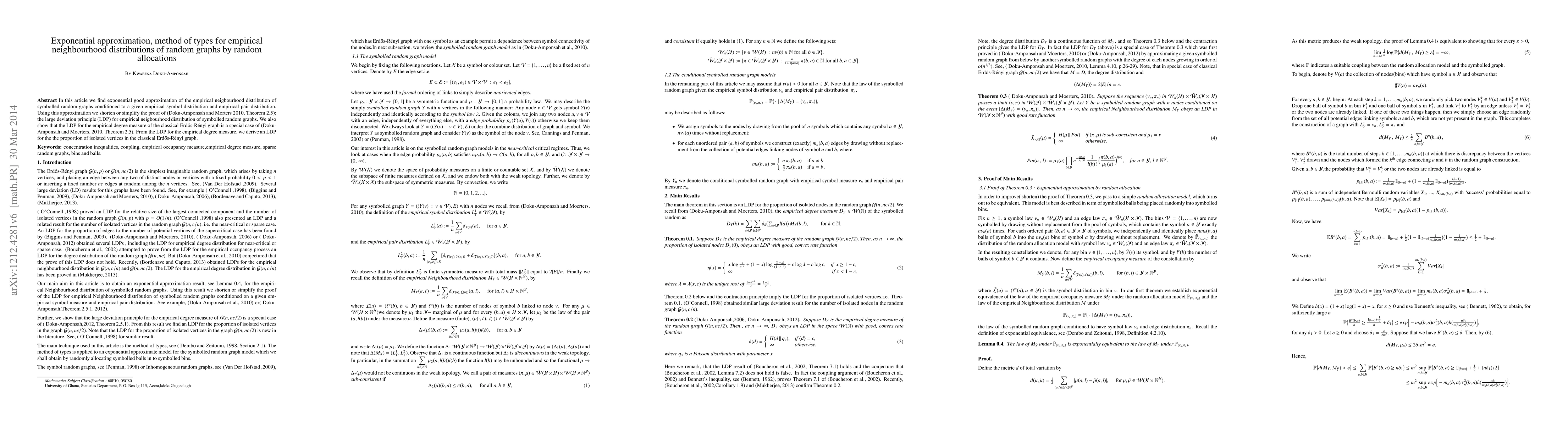 In this article we find exponential good approximation of the empirical neigbourhood distribution of symbolled random graphs conditioned to a given empirical symbol distribution and empirical pair distribution. Using this approximation we shorten or simplify the proof of (Doku-Amponsah and Morters 2010, Theorem~2.5); the large deviation principle (LDP) for empirical neigbourhood distribution of symbolled random graphs. We also show that the LDP for the empirical degree measure of the classical Erd\H{o}s-R\'{e}nyi graph is a special case of (Doku-Amponsah and Moerters, 2010, Theorem~2.5). From the LDP for the empirical degree measure, we derive an LDP for the the proportion of isolated vertices in the classical Erd\H{o}s-R\'{e}nyi graph.
