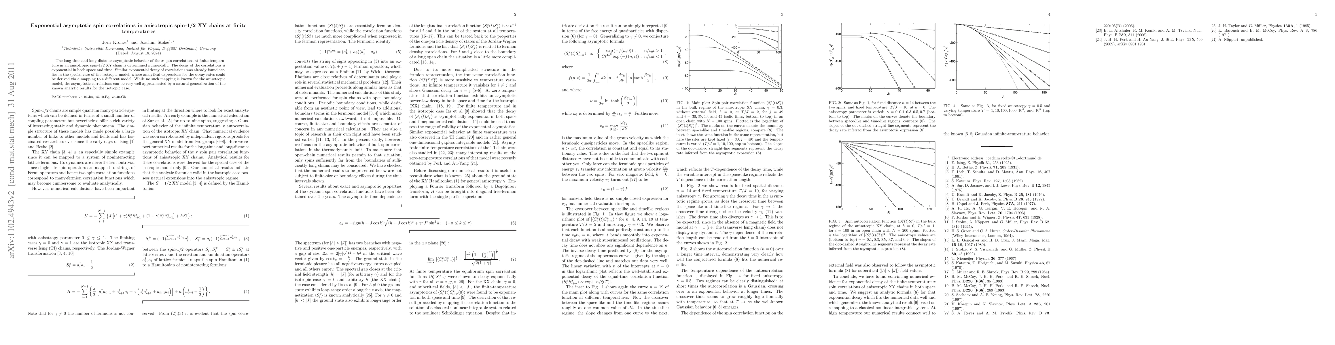 This paper numerically investigates the long-time and long-distance behavior of spin correlations in anisotropic spin-1/2 XY chains at finite temperature, finding exponential decay in both space and time. Although no analytical mapping exists for the anisotropic model, the results closely match a generalized form of the known analytical expressions from the isotropic case.