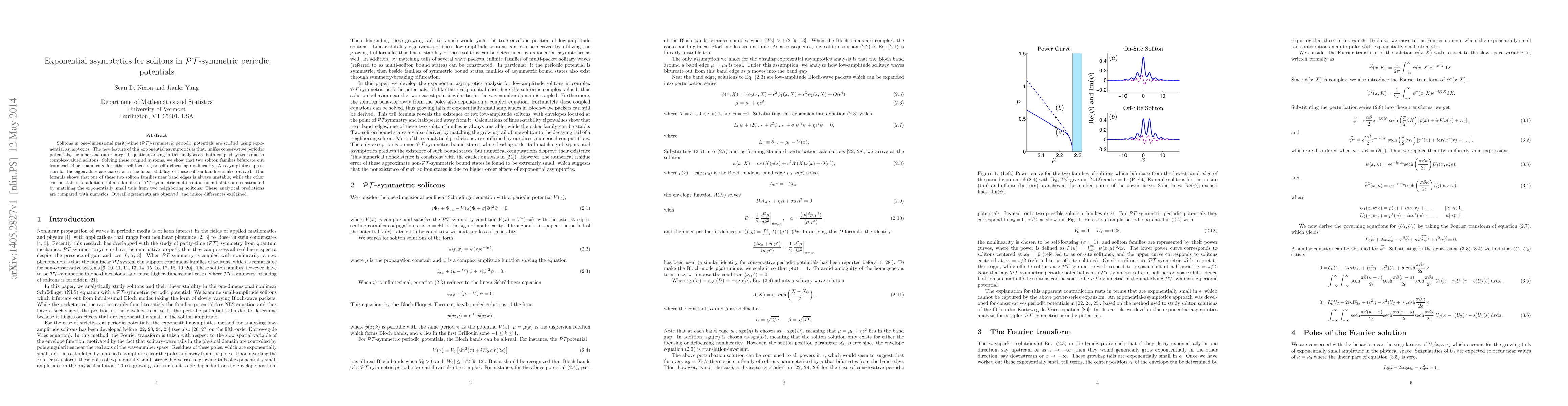 This paper studies solitons in PT-symmetric periodic potentials using exponential asymptotics, revealing coupled systems due to complex-valued solitons. It finds two soliton families bifurcating from each Bloch-band edge, with one unstable and the other potentially stable, and constructs infinite families of PT-symmetric multi-soliton bound states, with analytical predictions corroborated by numerics.
