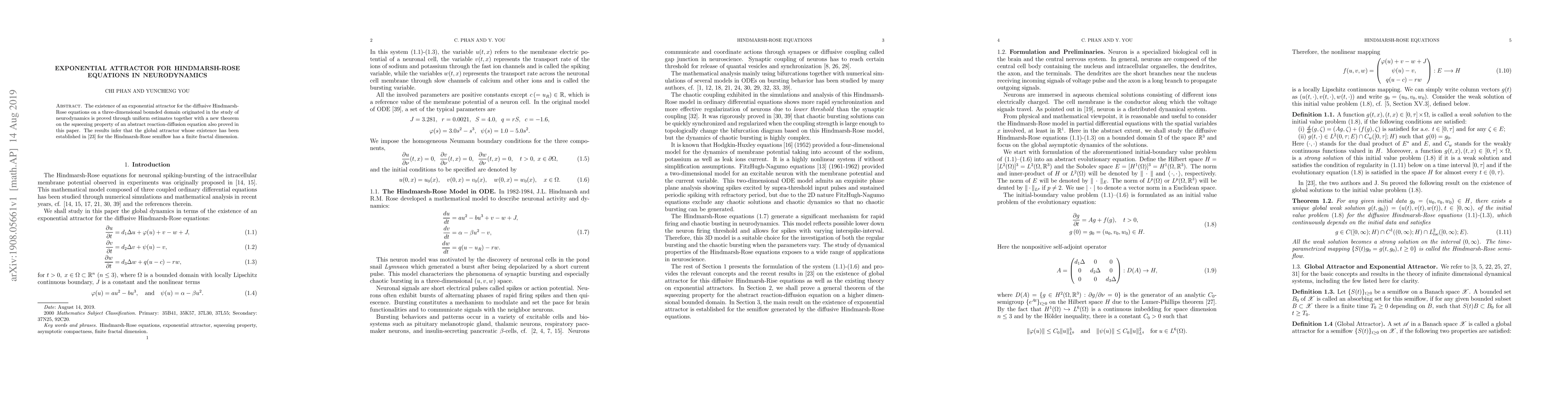 The paper proves the existence of an exponential attractor for the diffusive Hindmarsh-Rose equations, establishing a finite fractal dimension for the global attractor in neurodynamics. This is achieved through uniform estimates and a new theorem on the squeezing property of reaction-diffusion equations.