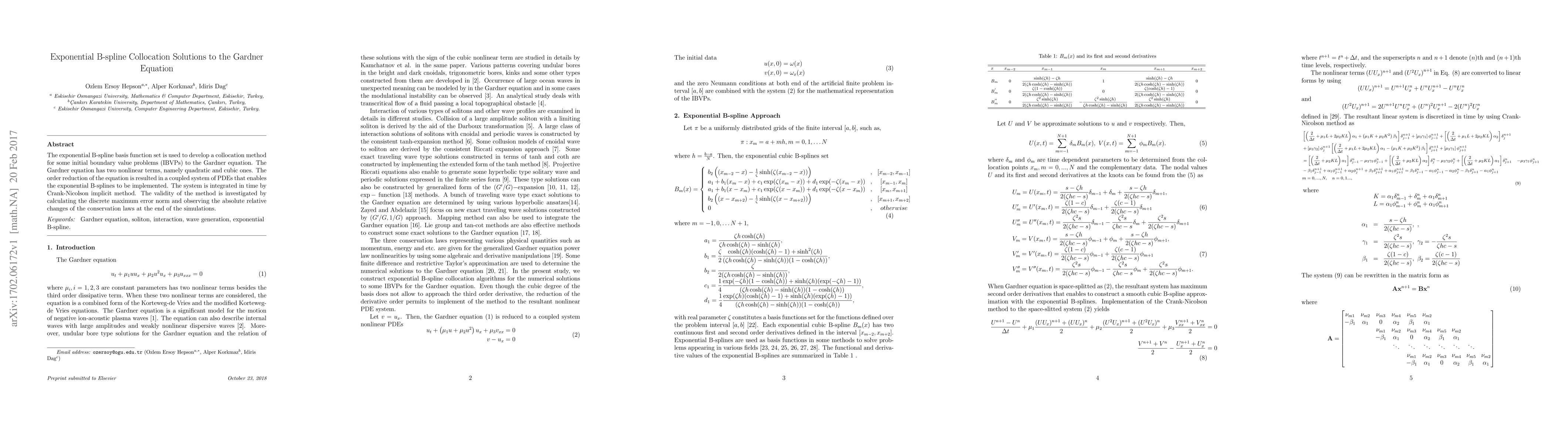 This paper proposes an exponential B-spline collocation method for solving the Gardner equation, which involves quadratic and cubic nonlinear terms. The method is validated through the Crank-Nicolson implicit integration and assessed by calculating the discrete maximum error norm and monitoring conservation laws.