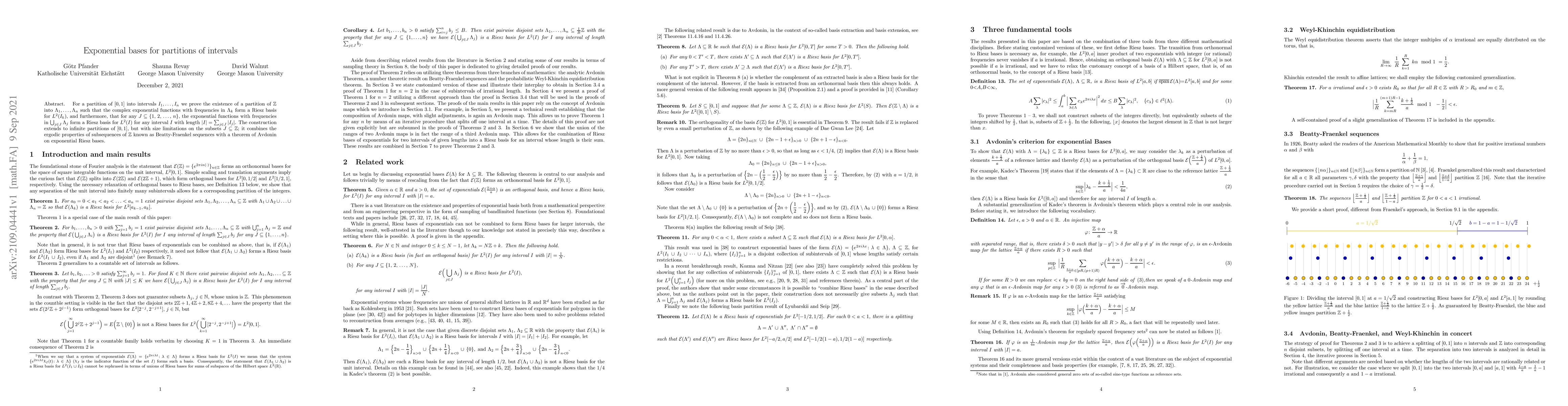 This paper proves the existence of a partition of $\mathbb{Z}$ into subsets such that complex exponential functions with frequencies in these subsets form Riesz bases for $L^2$ spaces of corresponding intervals in $[0,1]$. The construction leverages Beatty-Fraenkel sequences and Avdonin's theorem to extend the result to infinite partitions with size constraints.