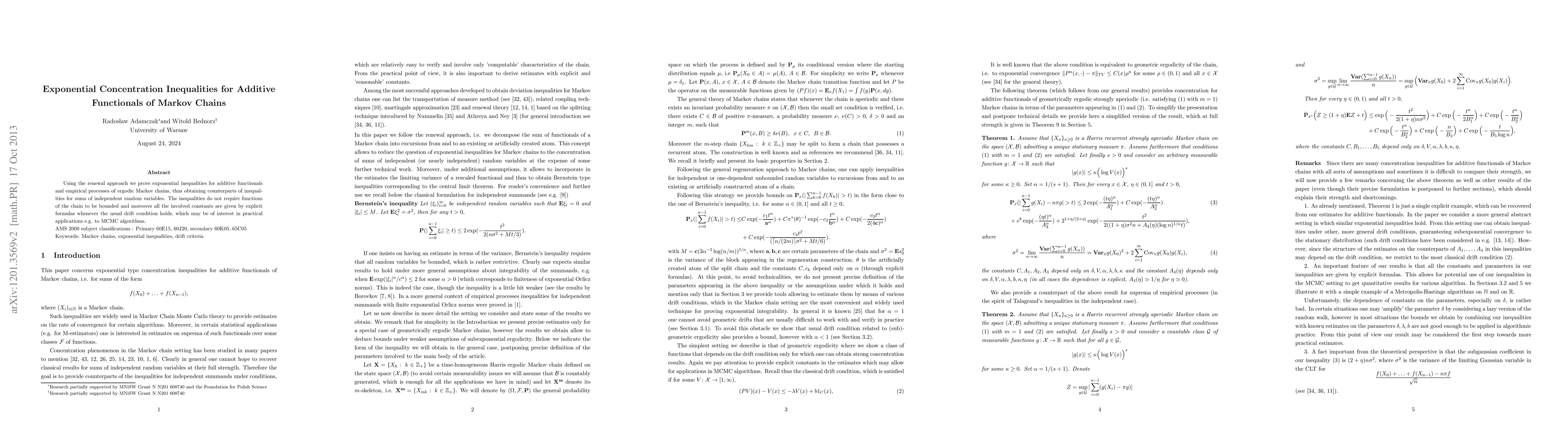 This paper proves exponential concentration inequalities for additive functionals and empirical processes of ergodic Markov chains, providing results analogous to those for sums of independent random variables without requiring boundedness of the functions. Explicit formulas for the involved constants under the usual drift condition are also provided, useful for practical applications like MCMC algorithms.